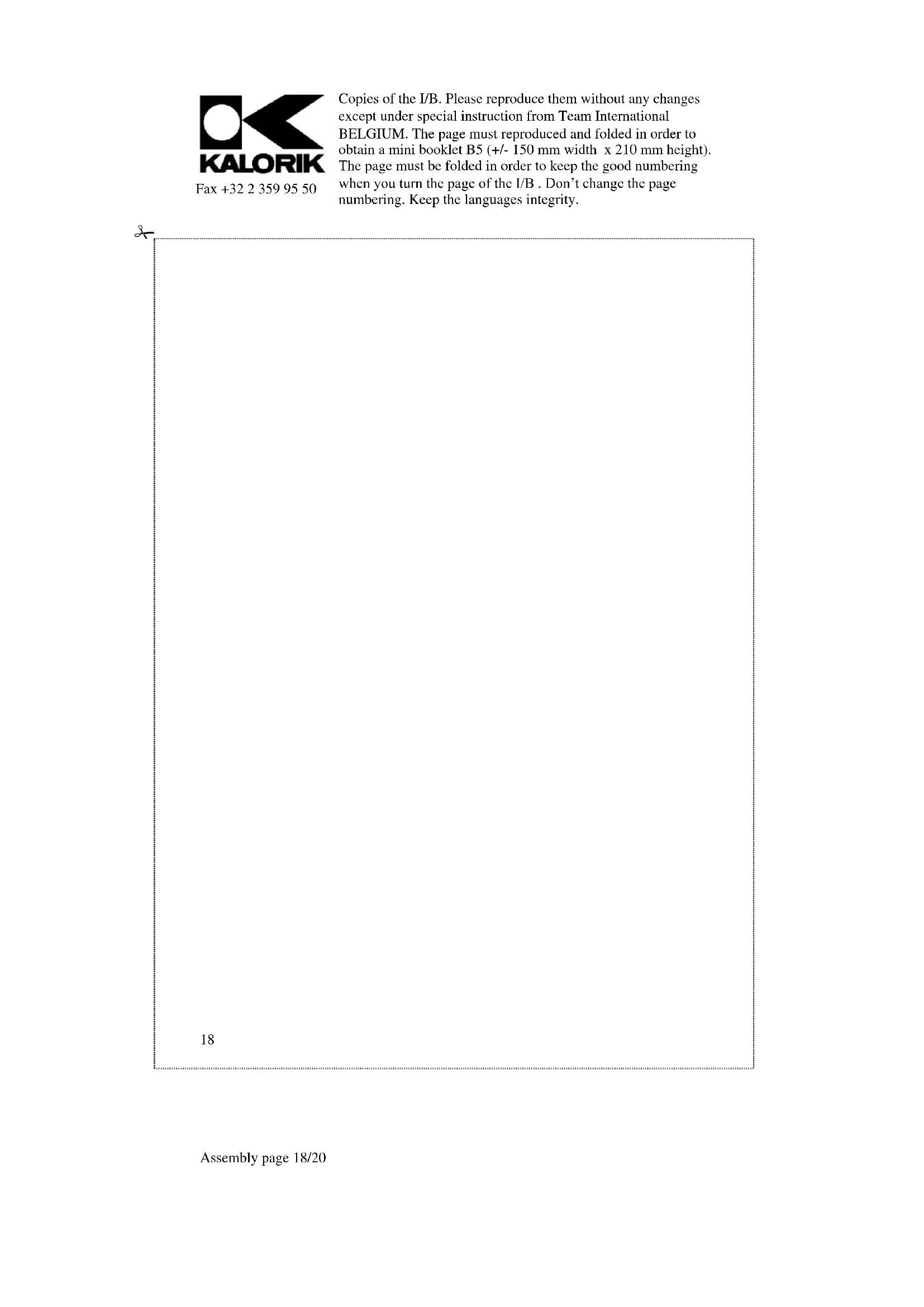 Copies of the I/B. Please reproduce them without any changes except under special instruction from Team International BELGIUM. The page must reproduced and folded in order to obtain a mini booklet B5 (+/- 150 mm width x 210 mm height). The page must be folded in order to keep the good numbering when you turn the page of the I/B. Don't change the page numbering. Keep the languages integrity.