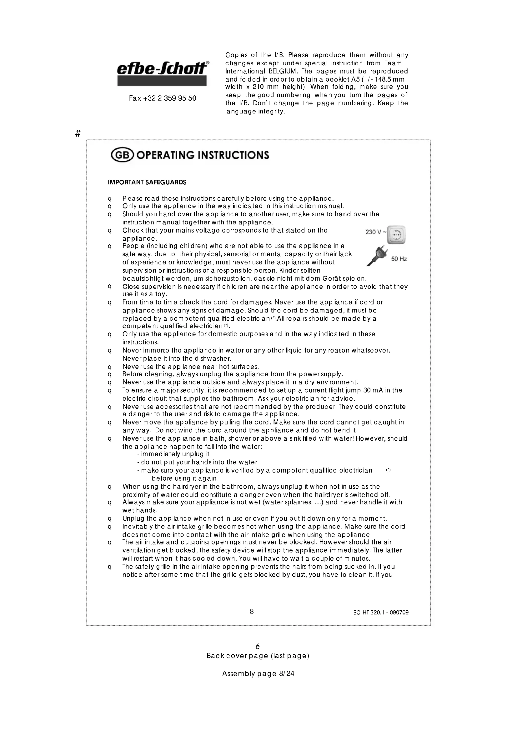 Back cover page (last page) Assembly page 23/24 Fax +32 2 359 95 50# Copies of the I/B. Please reproduce them without any changes except under special instruction from Team International BELGIUM. The pages must be reproduced and folded in order to obtain a booklet A5 (+/- 148.5 mm width x 210 mm height). When folding, make sure you keep the good numbering when you turn the pages of the I/B. Don’t change the page numbering. Keep the language integrity.