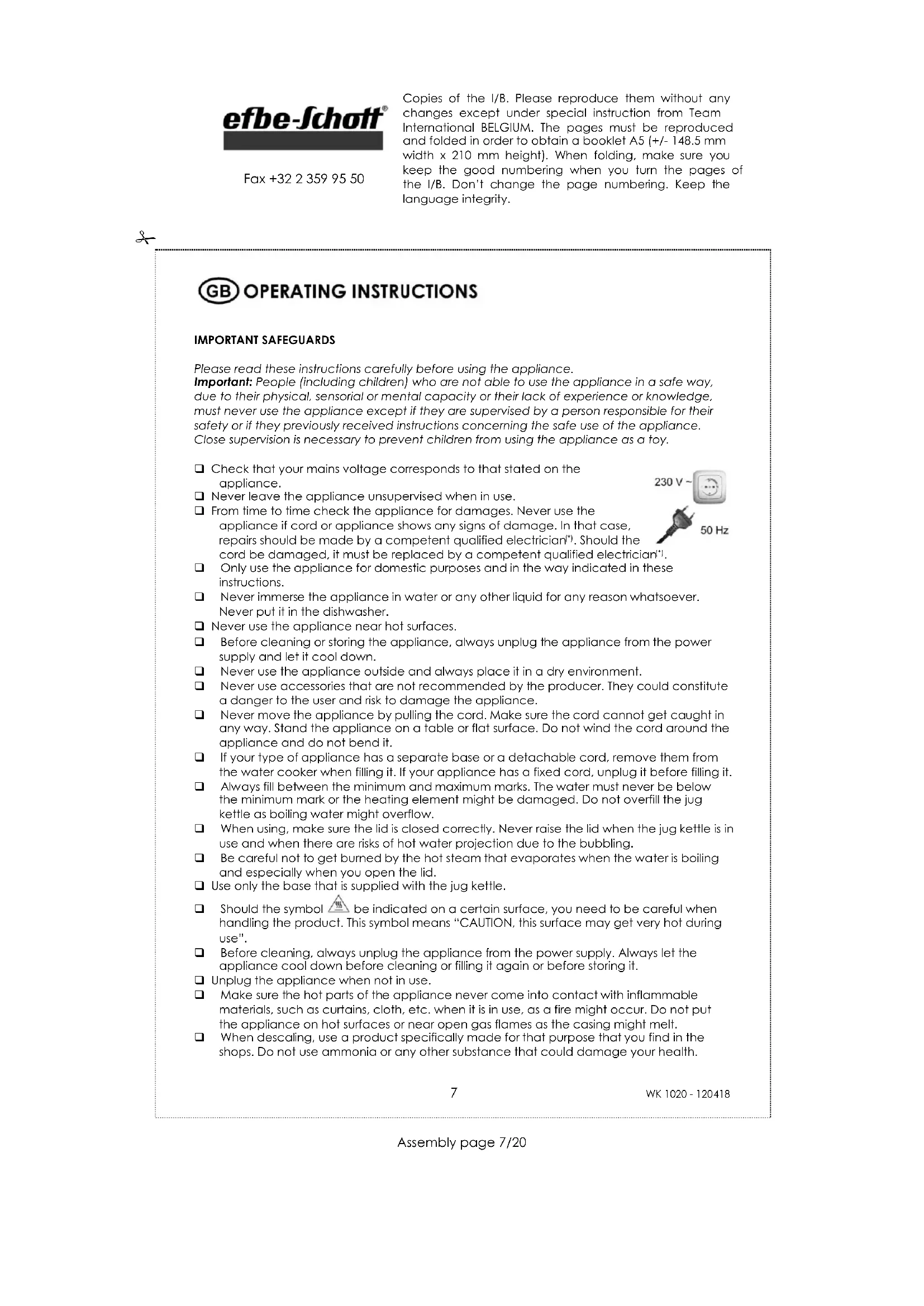 I/B Version 120418 Art. Nr.: WK 1020 220-240 V ~ 1850-2200 W Copies of the I/B. Please reproduce them without any changes except under special instruction from Team International BELGIUM. The pages must be reproduced and folded in order to obtain a booklet A5 (+/- 148.5 mm width x 210 mm height). When folding, make sure you keep the good numbering when you turn the pages of the I/B. Don’t change the page numbering. Keep the language integrity. 2 WK 1020 - 120418