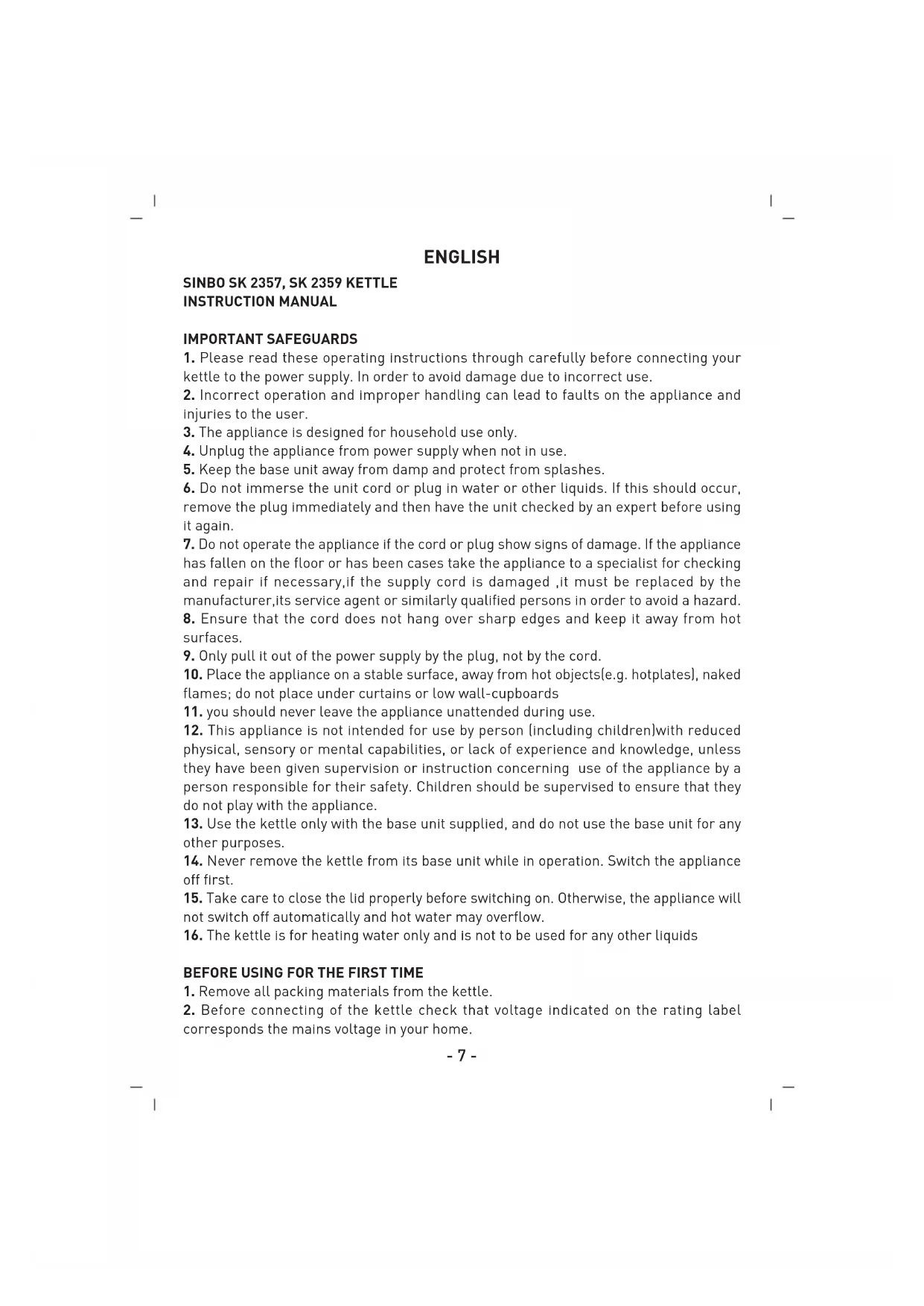 SK2357 - Kettle SINBO - Free user manual and instructions