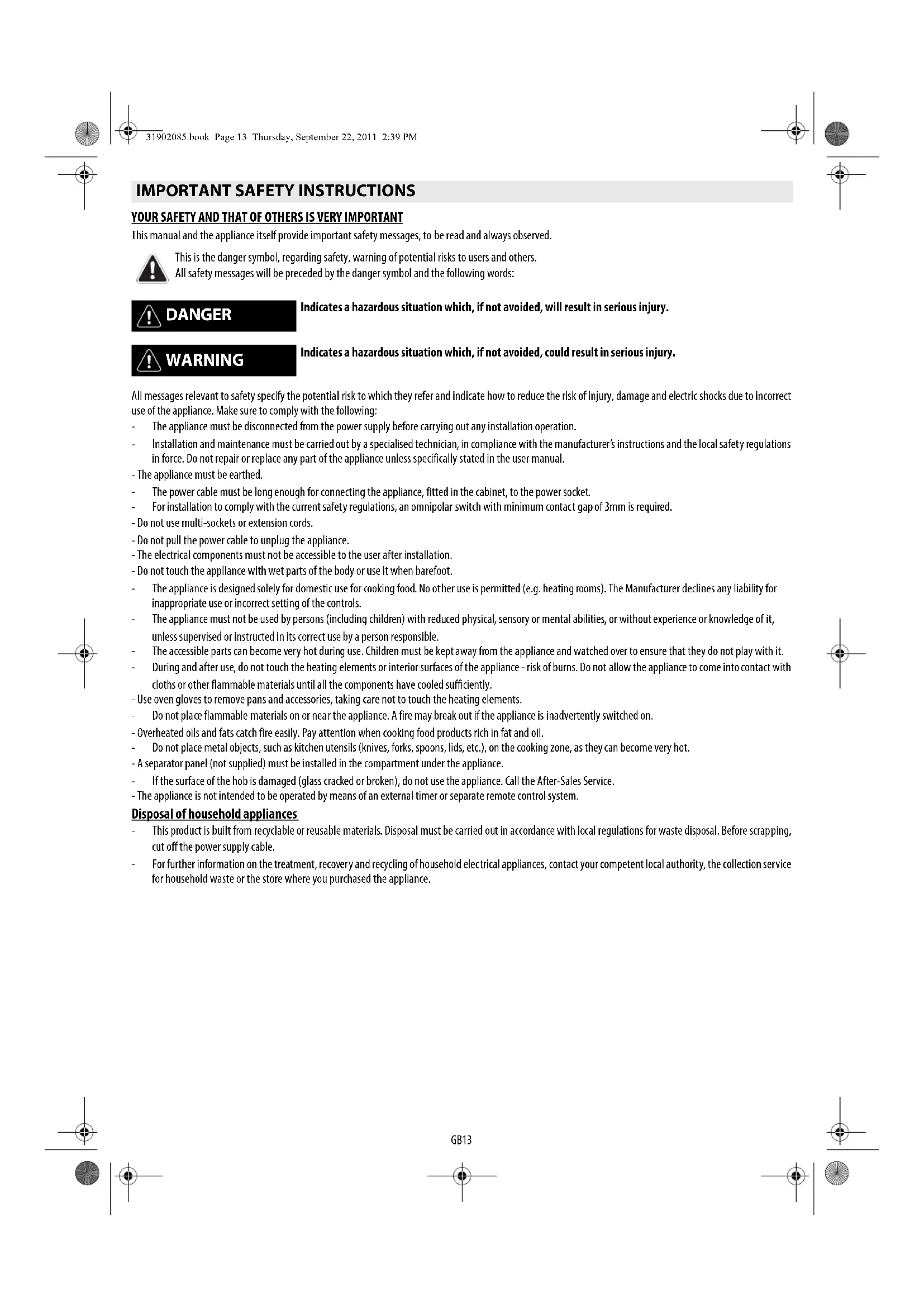 This is the danger symbol, regarding safety, warning of potential risks to users and others. All safety messages will be preceded by the danger symbol and the following words: DANGER Indicates a hazardous situation which, if not avoided, will result in serious injury. WARNING Indicates a hazardous situation which, if not avoided, could result in serious injury. ENGLISH Installation Page 2 Instructions for use Page 31902085.book Page 13 Thursday, September 22, 2011 2:39 PMGB14 Disposal of packing The packing material is 100% recyclable and marked with the recycling symbol ( ). The various parts of the packing must not be dispersed in the environment, but disposed of in compliance with local regulations. Disposal This appliance is marked in conformity with European Directive 2002/96/EC on Waste Electrical and Electronic Equipment (WEEE). By ensuring that this appliance is correctly disposed of, the user can help prevent potentially negative consequences for the environment and health. The symbol on the appliance or the accompanying documentation indicates that this product should not be treated as domestic waste but must be taken to an appropriate collection point for recycling WEEE. Energy saving For optimum results, it is advisable to: