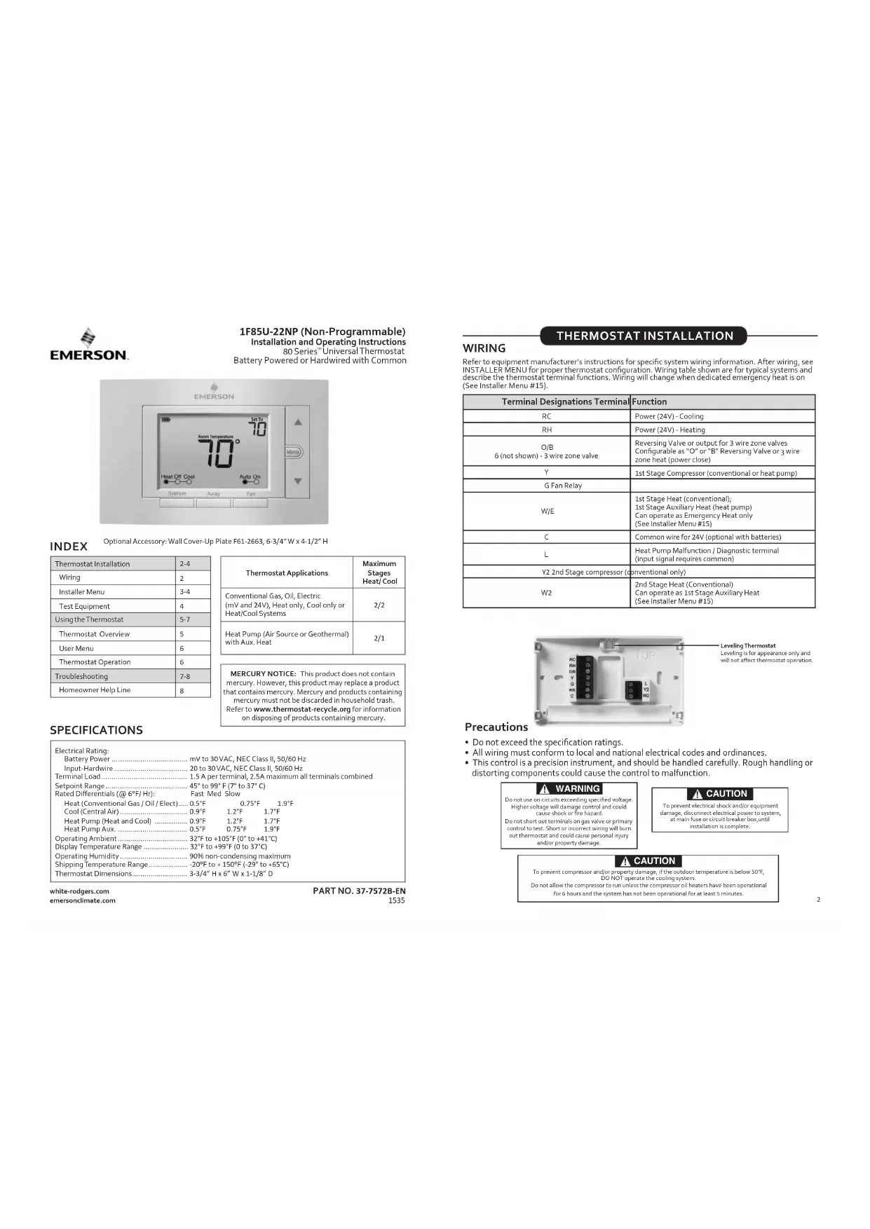 Download the instructions for your Thermostat in PDF format for free! Find your manual 1F85U22NP - Emerson and take your electronic device back in hand. On this page are published all the documents necessary for the use of your device. 1F85U22NP by Emerson.