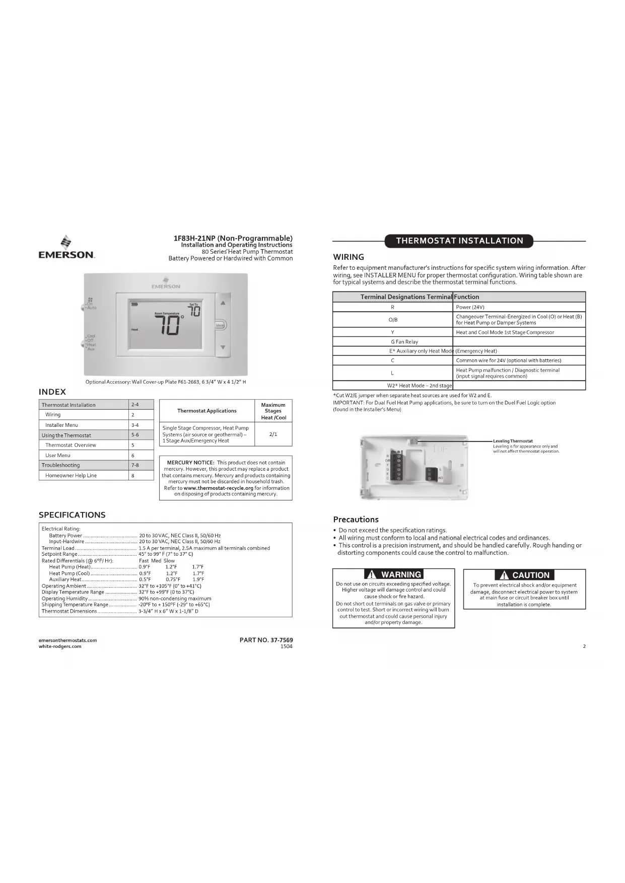 1F83H-21NP (Non-Programmable) Installation and Operating Instructions80 Series Heat Pump ThermostatBattery Powered or Hardwired with Commonemersonthermostats.comwhite-rodgers.comThermostat Applications Maximum Stages Heat /Cool Single Stage Compressor, Heat Pump Systems (air source or geothermal) – 1 Stage Aux/Emergency Heat 2/1 Thermostat Installation 2-4 Wiring Installer Menu 3-4 Using the Thermostat 5-6 Thermostat Overview User Menu Troubleshooting 7-8 Homeowner Help Line