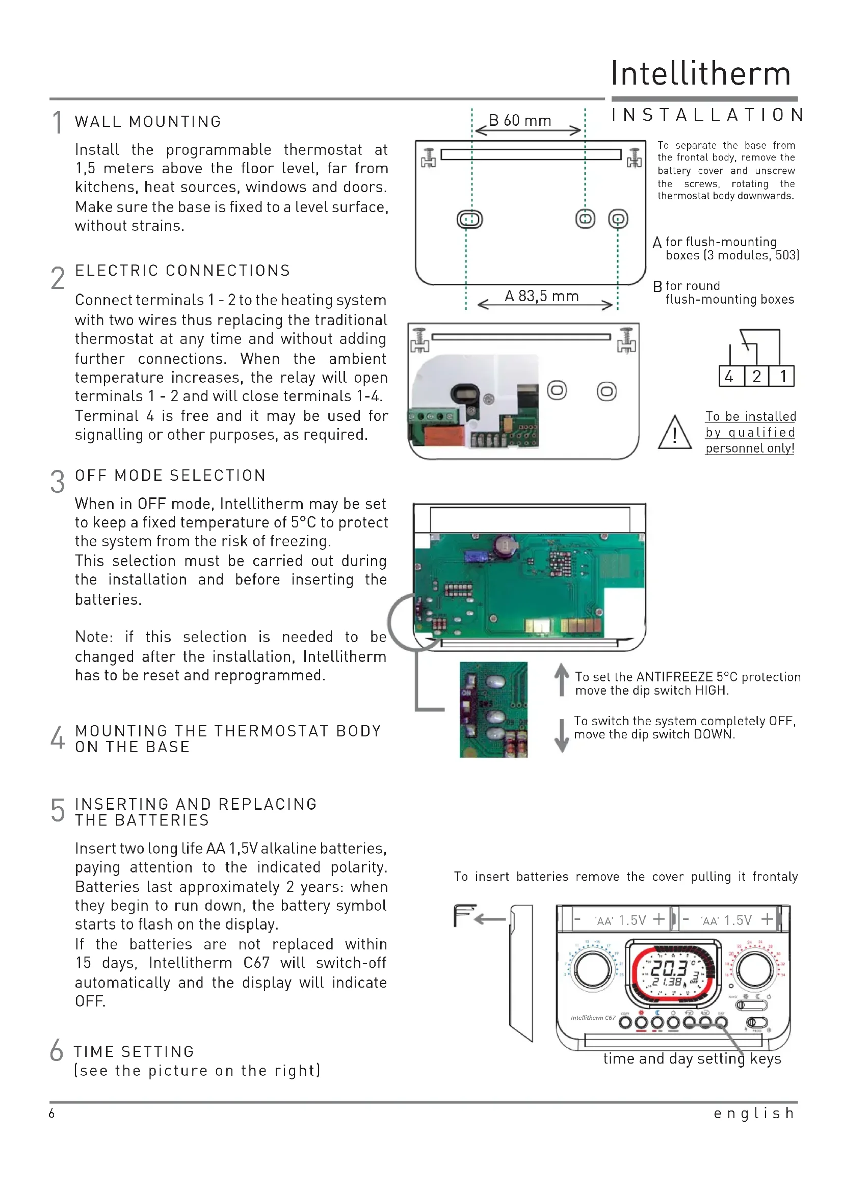 ELECTRIC CONNECTIONSConnect terminals 1 - 2 to the heating system with two wires thus replacing the traditional thermostat at any time and without adding further connections. When the ambient temperature increases, the relay will open terminals 1 - 2 and will close terminals 1-4.Terminal 4 is free and it may be used for signalling or other purposes, as required. OFF MODE SELECTIONWhen in OFF mode, Intellitherm may be set to keep a fixed temperature of 5°C to protect the system from the risk of freezing. This selection must be carried out during the installation and before inserting the batteries.Note: if this selection is needed to be changed after the installation, Intellitherm has to be reset and reprogrammed.To set the ANTIFREEZE 5°C protection move the dip switch HIGH.To switch the system completely OFF, move the dip switch DOWN. WALL MOUNTINGTo be installed by qualified personnel only!Install the programmable thermostat at 1,5 meters above the floor level, far from kitchens, heat sources, windows and doors. Make sure the base is fixed to a level surface, without strains. INSTALLATION Intellitherm english