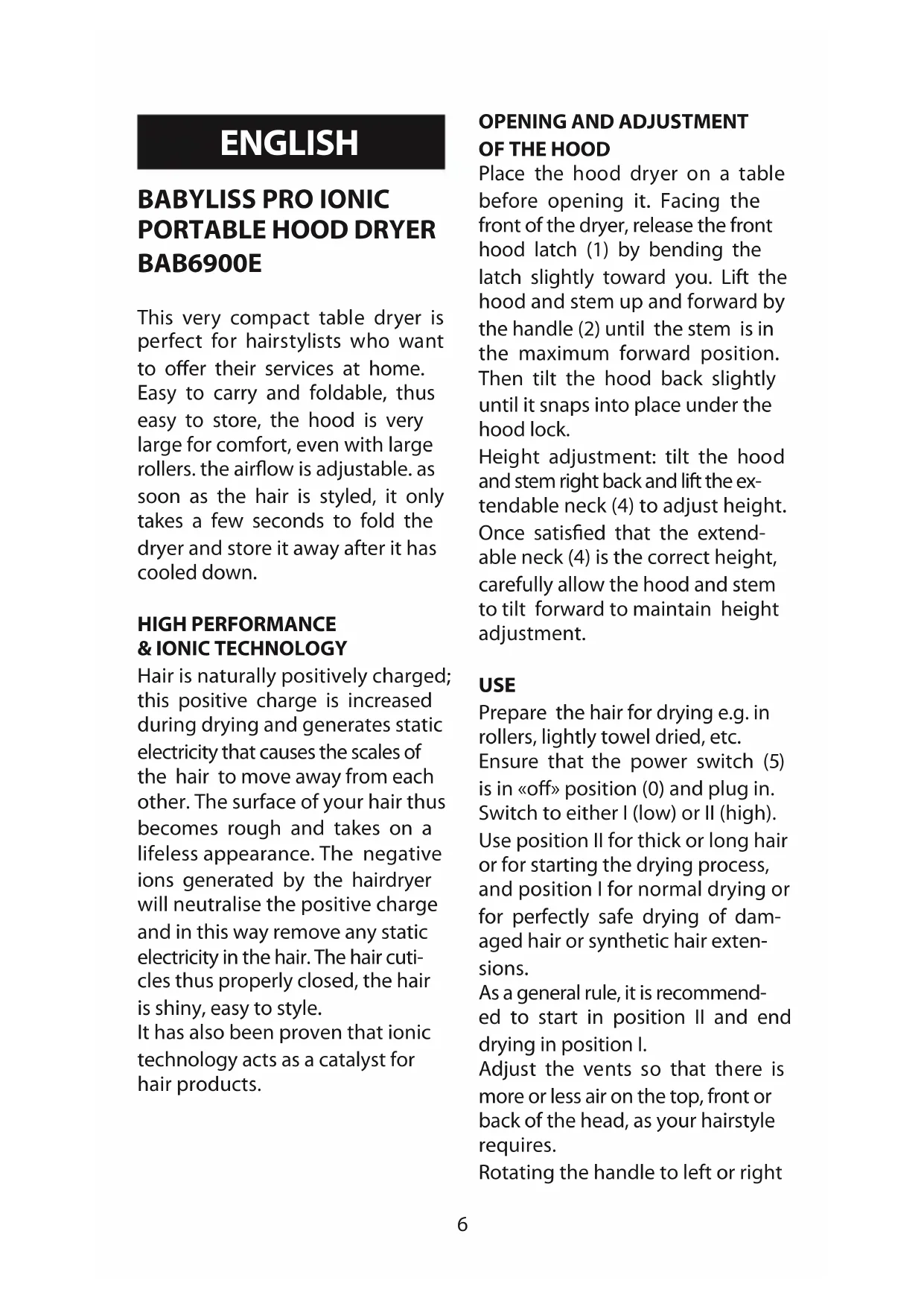 BAB6900E This very compact table dryer is perfect for hairstylists who want to offer their services at home. Easy to carry and foldable, thus easy to store, the hood is very large for comfort, even with large rollers. the airflow is adjustable. as soon as the hair is styled, it only takes a few seconds to fold the dryer and store it away after it has cooled down. HIGH PERFORMANCE & IONIC TECHNOLOGY Hair is naturally positively charged; this positive charge is increased during drying and generates static electricity that causes the scales of the hair to move away from each other. The surface of your hair thus becomes rough and takes on a lifeless appearance. The negative ions generated by the hairdryer will neutralise the positive charge and in this way remove any static electricity in the hair. The hair cuti- cles thus properly closed, the hair is shiny, easy to style. It has also been proven that ionic technology acts as a catalyst for hair products.