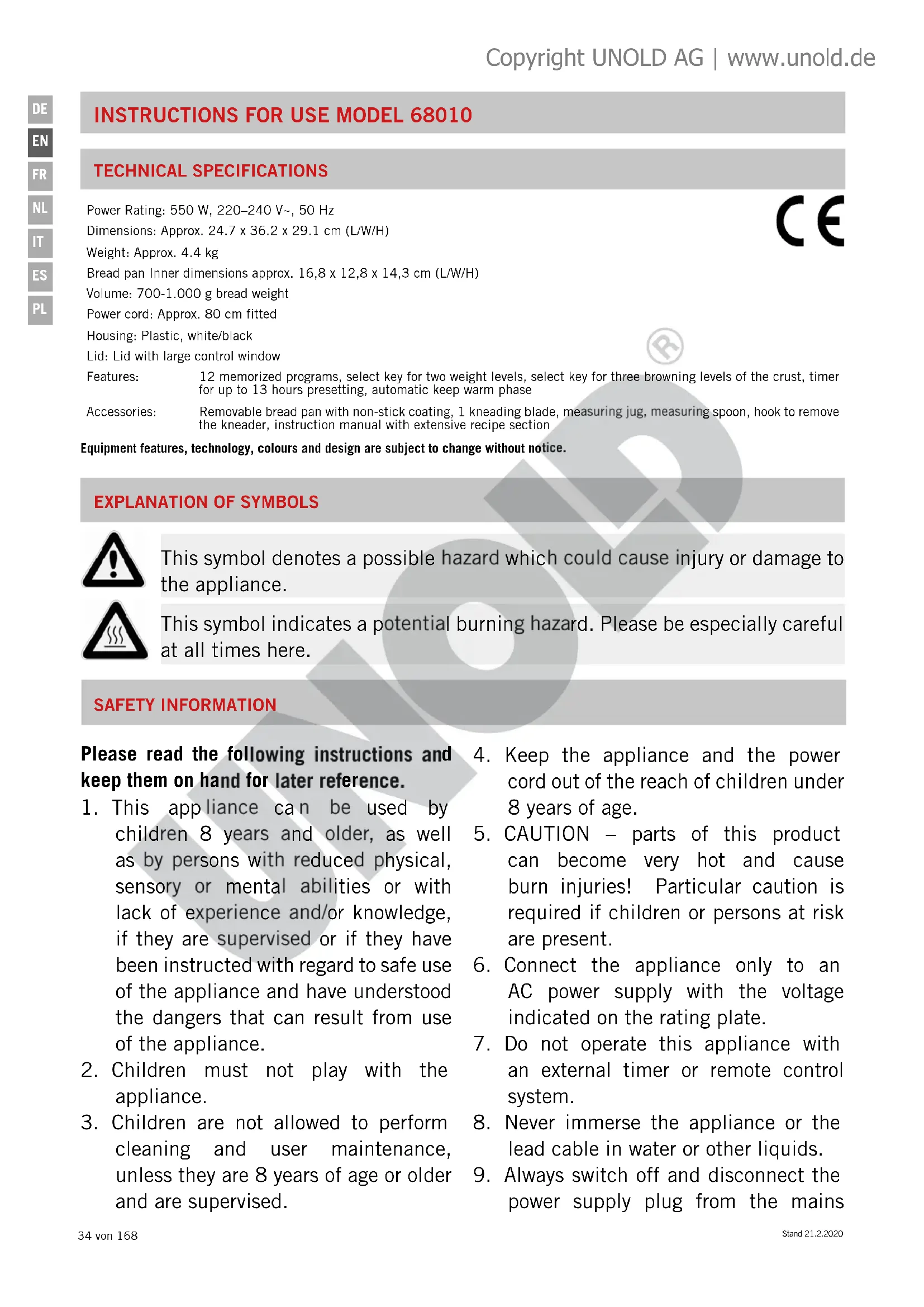 This symbol denotes a possible hazard which could cause injury or damage to the appliance. This symbol indicates a potential burning hazard. Please be especially careful at all times here. Copyright UNOLD AG | www.unold.deStand 21.2.2020 35 von 168