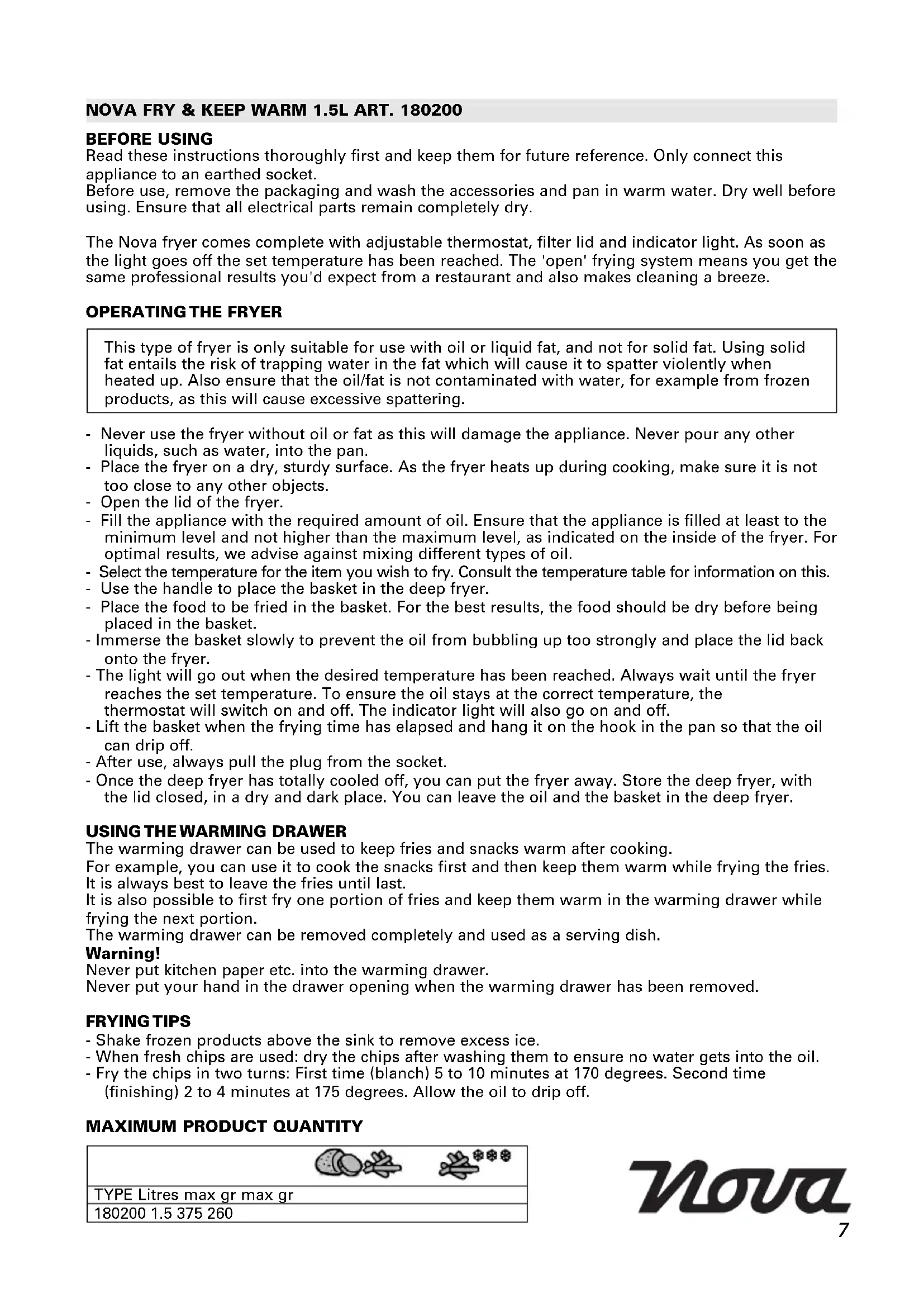 BEFORE USING Read these instructions thoroughly first and keep them for future reference. Only connect this appliance to an earthed socket. Before use, remove the packaging and wash the accessories and pan in warm water. Dry well before using. Ensure that all electrical parts remain completely dry. The Nova fryer comes complete with adjustable thermostat, filter lid and indicator light. As soon as the light goes off the set temperature has been reached. The 'open' frying system means you get the same professional results you'd expect from a restaurant and also makes cleaning a breeze.