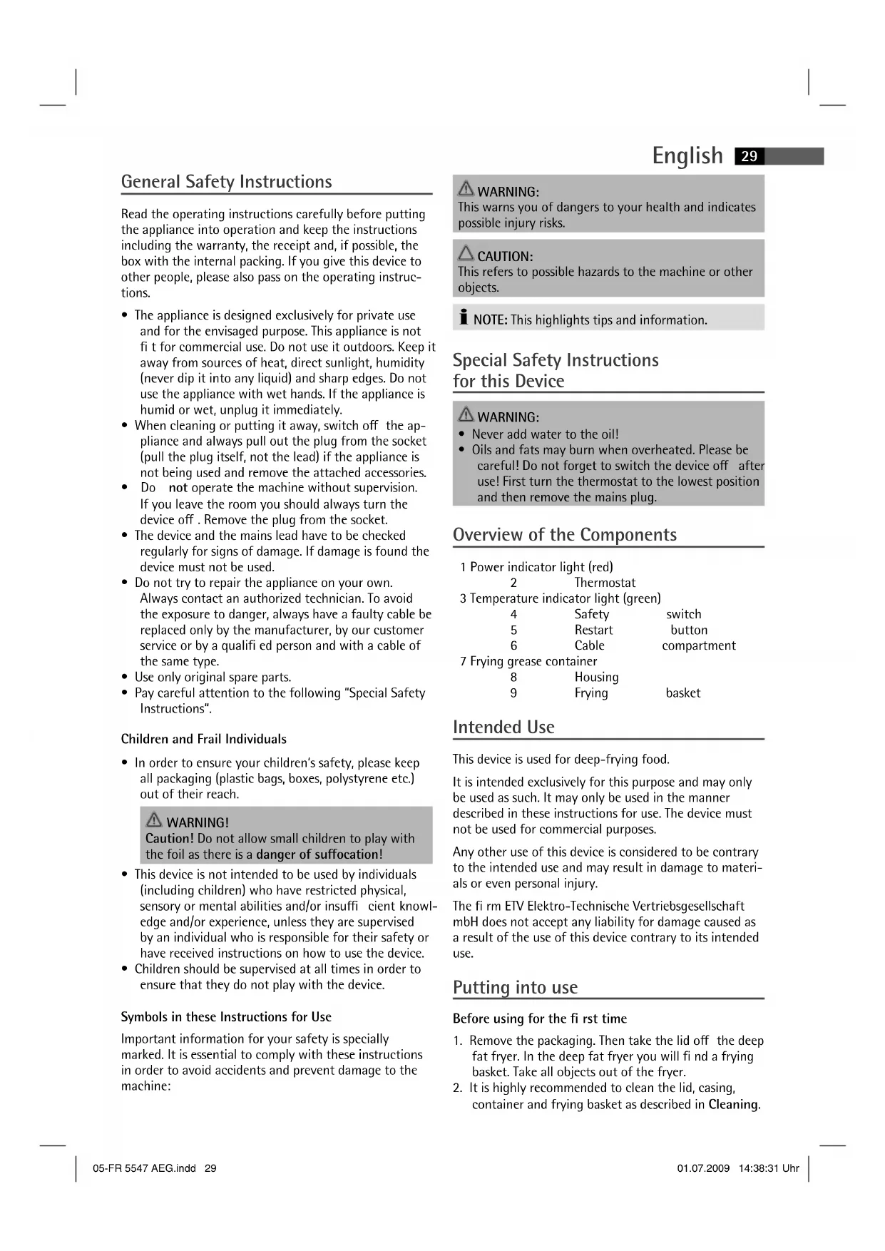 - Oils and fats may burn when overheated. Please be careful! Do not forget to switch the device o after use! First turn the thermostat to the lowest position and then remove the mains plug. Overview of the Components 1 Power indicator light (red) 2 Thermostat 3 Temperature indicator light (green) 4 Safety switch 5 Restart button 6 Cable compartment 7 Frying grease container 8 Housing 9 Frying basket Intended Use This device is used for deep-frying food. It is intended exclusively for this purpose and may only be used as such. It may only be used in the manner described in these instructions for use. The device must not be used for commercial purposes. Any other use of this device is considered to be contrary to the intended use and may result in damage to materi- als or even personal injury. The rm ETV Elektro-Technische Vertriebsgesellschaft mbH does not accept any liability for damage caused as a result of the use of this device contrary to its intended use. Putting into use Before using for the rst time