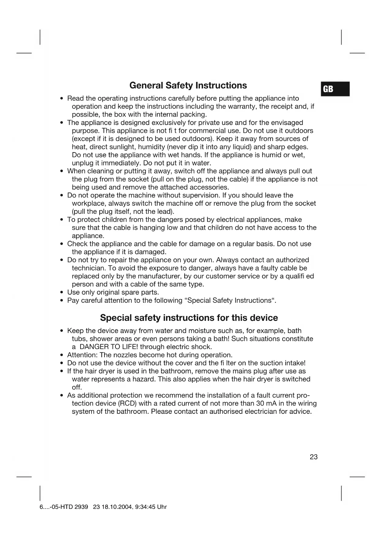 - As additional protection we recommend the installation of a fault current pro- tection device (RCD) with a rated current of not more than 30 mA in the wiring system of the bathroom. Please contact an authorised electrician for advice. 6....-05-HTD 2939 23 18.10.2004, 9:34:45 UhrGB