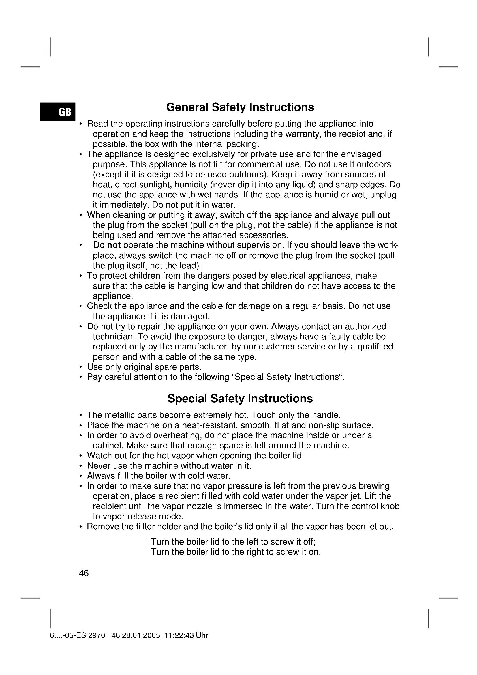 - Lubricate the boiler opening and the fi lter holder with vegetable oil from time to time. This device has been tested according to all relevant current CE guidelines, such as electromagnetic compatibility and low voltage directives, and has been constructed in accordance with the latest safety regulations. Subject to technical changes without prior notice! Guarantee The device supplied by our Company is covered by a 24 month guarantee starting on the date of purchase (receipt). During the life of the guarantee any fault of the device or its accessories *) ascri- bable to material or manufacturing defects will be eliminated free of charge by repairing or, at our discretion, by replacing it. The guarantee services do not entail an extension of the life of the guarantee nor do they give rise to any right to a new guarantee! Proof of the guarantee is provided by the proof of purchase. Without proof of purchase no free replacement or repair will be carried out. If you wish to make a claim under the guarantee please return the entire machine in the original packaging to your dealer together with the receipt. *) Damage to accessories does not mean automatic free replacement of the whole machine. In such cases please contact our hotline. Broken glass or breakage of plastic parts are always subject to a charge. 6....-05-ES 2970 50 28.01.2005, 11:22:45 UhrGB