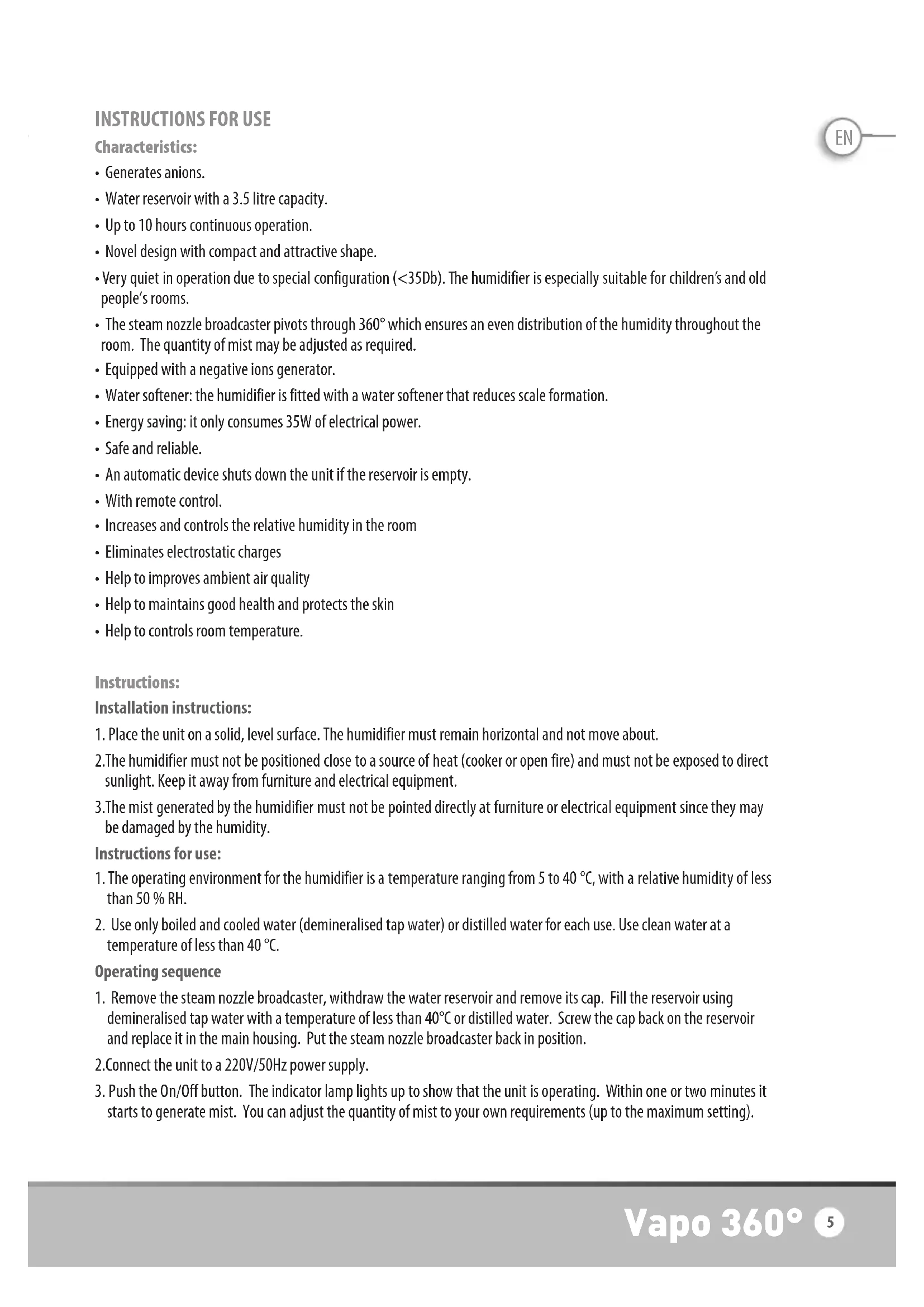 to continue to operate, add more water. VAPO 360° FUNCTIONS