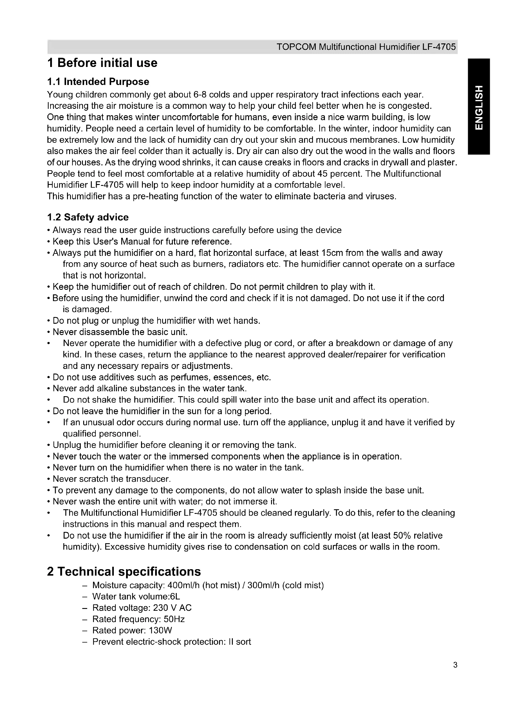 - Do not use the humidifier if the air in the room is already sufficiently moist (at least 50% relative humidity). Excessive humidity gives rise to condensation on cold surfaces or walls in the room. 2 Technical specifications – Moisture capacity: 400ml/h (hot mist) / 300ml/h (cold mist) – Water tank volume:6L – Rated voltage: 230 V AC – Rated frequency: 50Hz – Rated power: 130W – Prevent electric-shock protection: II sort4 TOPCOM Multifunctional Humidifier LF-4705 3 Description