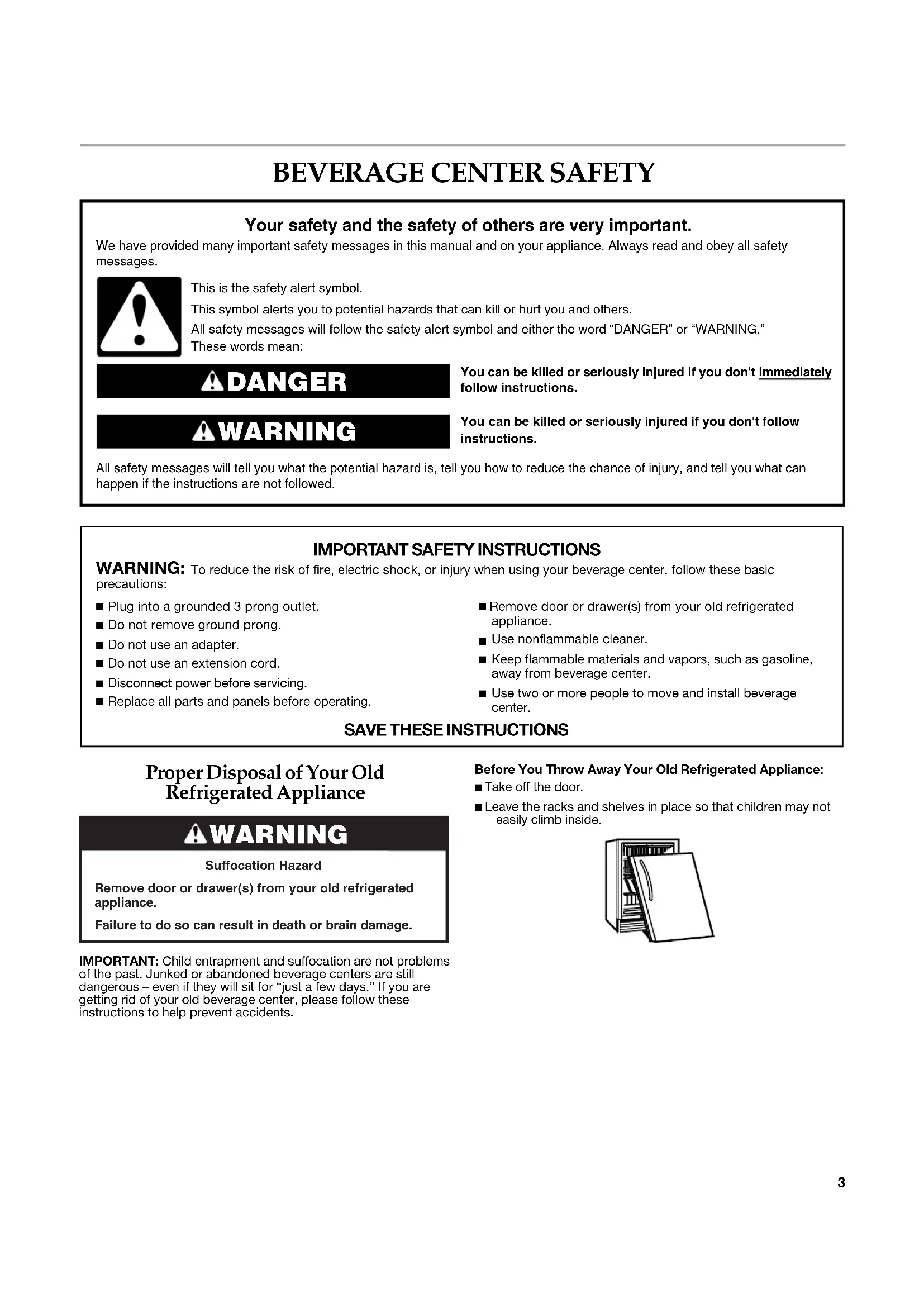 Proper Disposal of Your Old Refrigerated Appliance IMPORTANT: Child entrapment and suffocation are not problems of the past. Junked or abandoned beverage centers are still dangerous – even if they will sit for “just a few days.” If you are getting rid of your old beverage center, please follow these instructions to help prevent accidents.Before You Throw Away Your Old Refrigerated Appliance:■ Take off the door.■ Leave the racks and shelves in place so that children may not easily climb inside.You can be killed or seriously injured if you don't immediately You can be killed or seriously injured if you don'tfollow All safety messages will tell you what the potential hazard is, tell you how to reduce the chance of injury, and tell you what can happen if the instructions are not followed. Your safety and the safety of others are very important. We have provided many important safety messages in this manual and on your appliance. Always read and obey all safety messages.This is the safety alert symbol.This symbol alerts you to potential hazards that can kill or hurt you and others.All safety messages will follow the safety alert symbol and either the word “DANGER” or “WARNING.”These words mean:follow instructions.instructions. DANGER WARNING