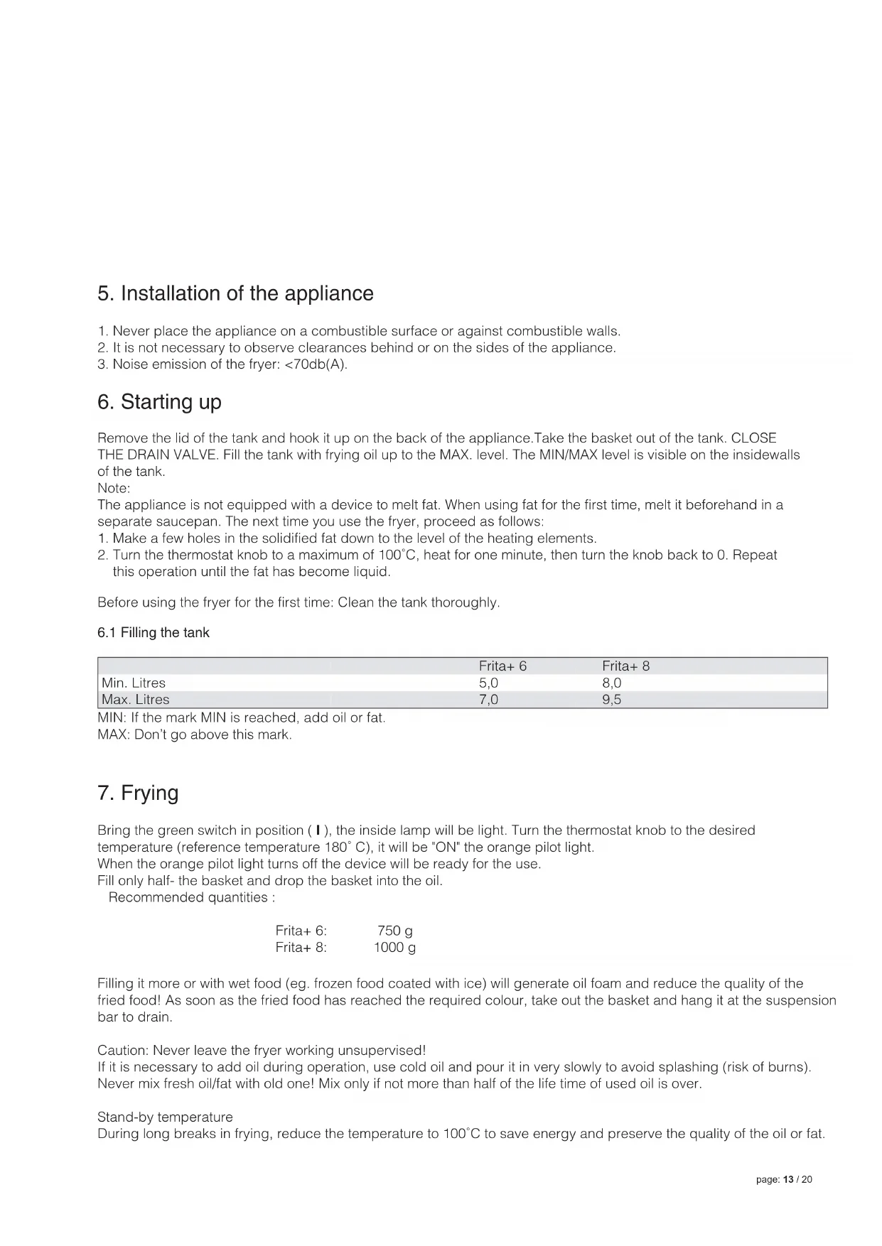 Bring the green switch in position ( I ), the inside lamp will be light. Turn the thermostat knob to the desired temperature (reference temperature 180˚ C), it will be "ON" the orange pilot light. When the orange pilot light turns off the device will be ready for the use. Fill only half- the basket and drop the basket into the oil. Recommended quantities : Frita+ 6: 750 g Frita+ 8: 1000 g Filling it more or with wet food (eg. frozen food coated with ice) will generate oil foam and reduce the quality of the fried food! As soon as the fried food has reached the required colour, take out the basket and hang it at the suspension bar to drain. Caution: Never leave the fryer working unsupervised! If it is necessary to add oil during operation, use cold oil and pour it in very slowly to avoid splashing (risk of burns). Never mix fresh oil/fat with old one! Mix only if not more than half of the life time of used oil is over. Stand-by temperature During long breaks in frying, reduce the temperature to 100˚C to save energy and preserve the quality of the oil or fat. page: 13 / 20 Before using the fryer for the first time: Clean the tank thoroughly.8. Warnings The fryer should never be allowed to work empty. Should this happen by mistake, the safety thermostat will cut off the fryer. An overfilled basket or filled with products that are too wet (eg. ice crystals on frozen food) will make the oil froth and this will reduce the quality of the fried food! If the oil catches fire, use an extinguisher blanket or an extinguisher system. Put the main switch on 0 and pull out the plug! NEVER POUR WATER ONTO BURNING OIL! To extinguish burning oil, it is necessary to have a fire extinguisher or a fixed extinguishing system at hand. Never move the fryer when it is hot! Before taking out the tank to change the oil, wait for the oil cools down to a max. of 60˚C. Old and spoiled oil will more easily foam over and catch fire. Danger of fire if oil level does reach the lower mark!