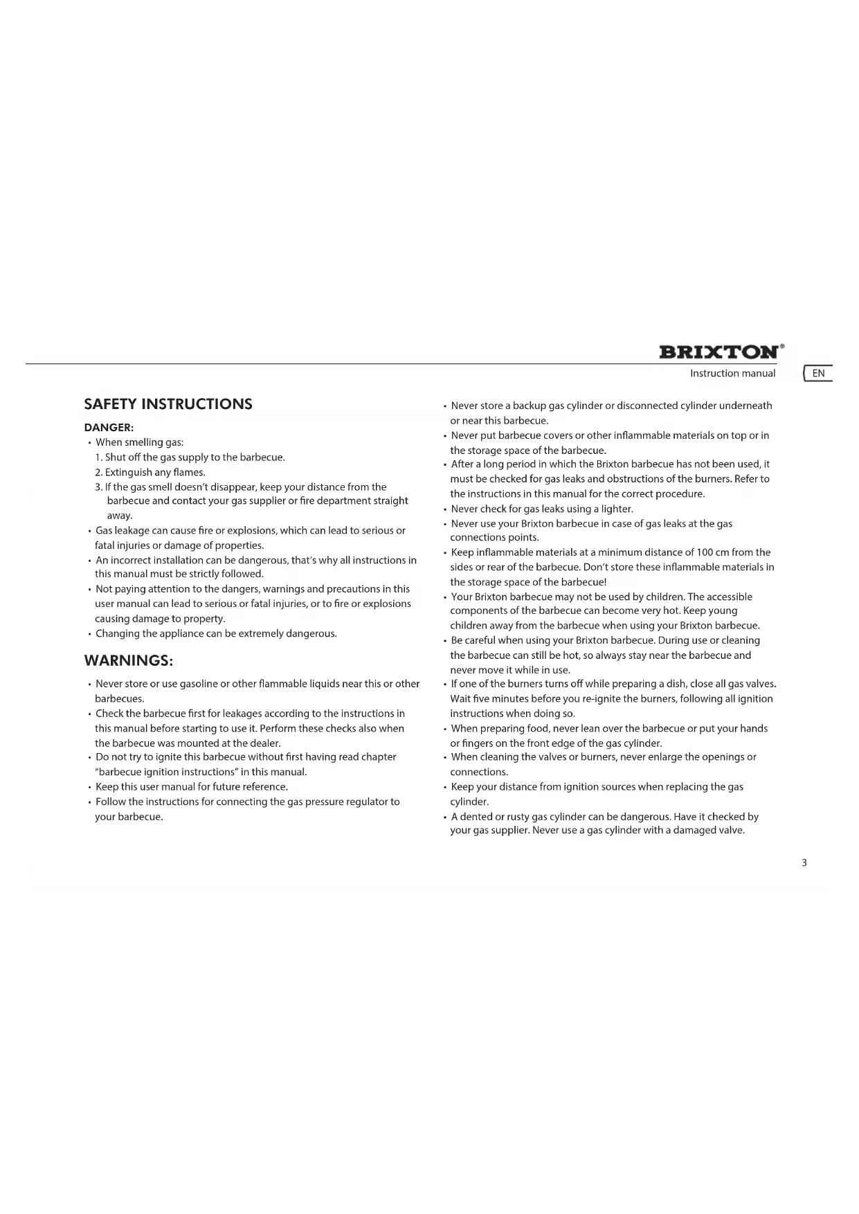 - Never use your Brixton barbecue in case of gas leaks at the gas connections points.