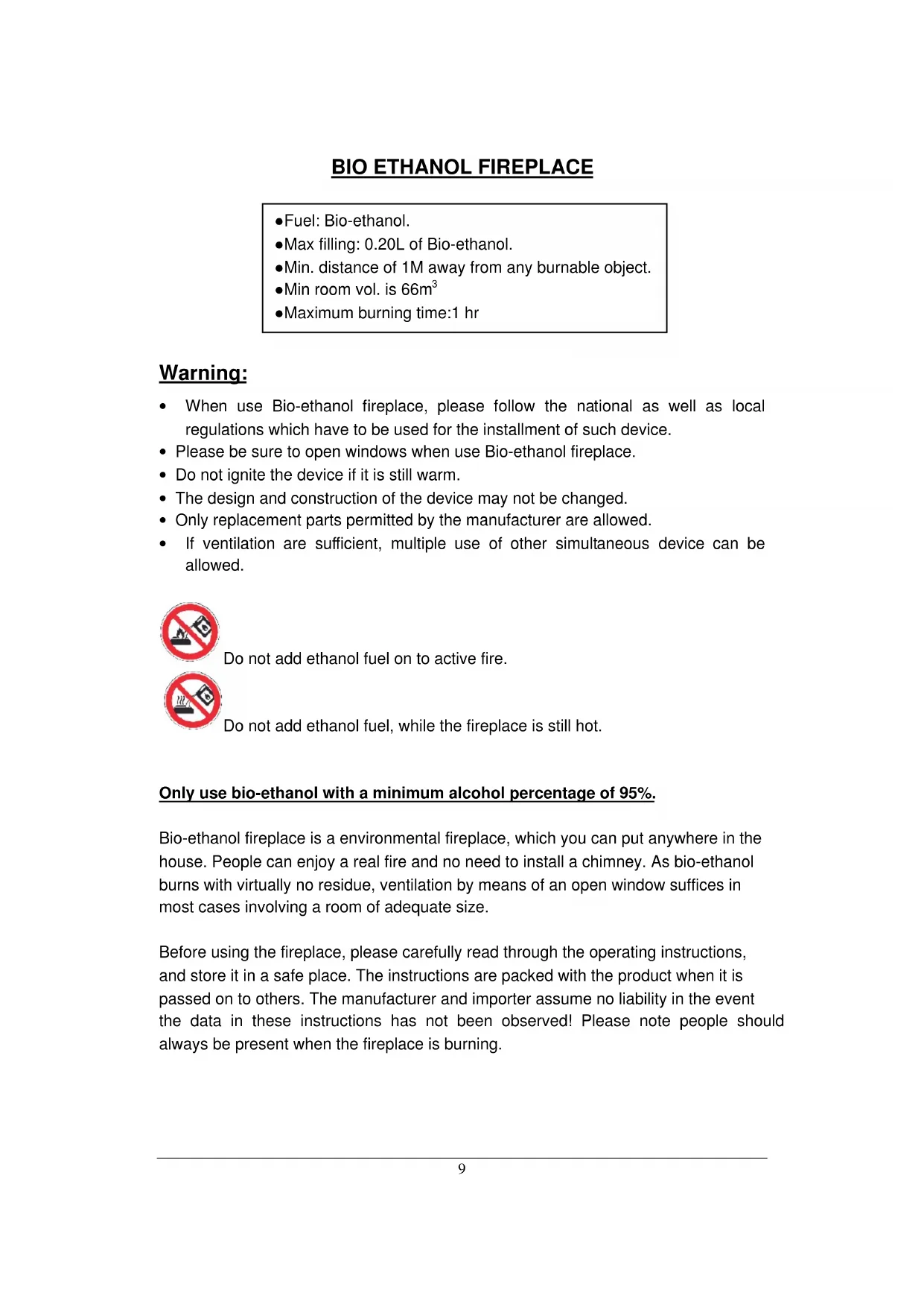 - If ventilation are sufficient, multiple use of other simultaneous device can be allowed. Do not add ethanol fuel on to active fire. Do not add ethanol fuel, while the fireplace is still hot.
