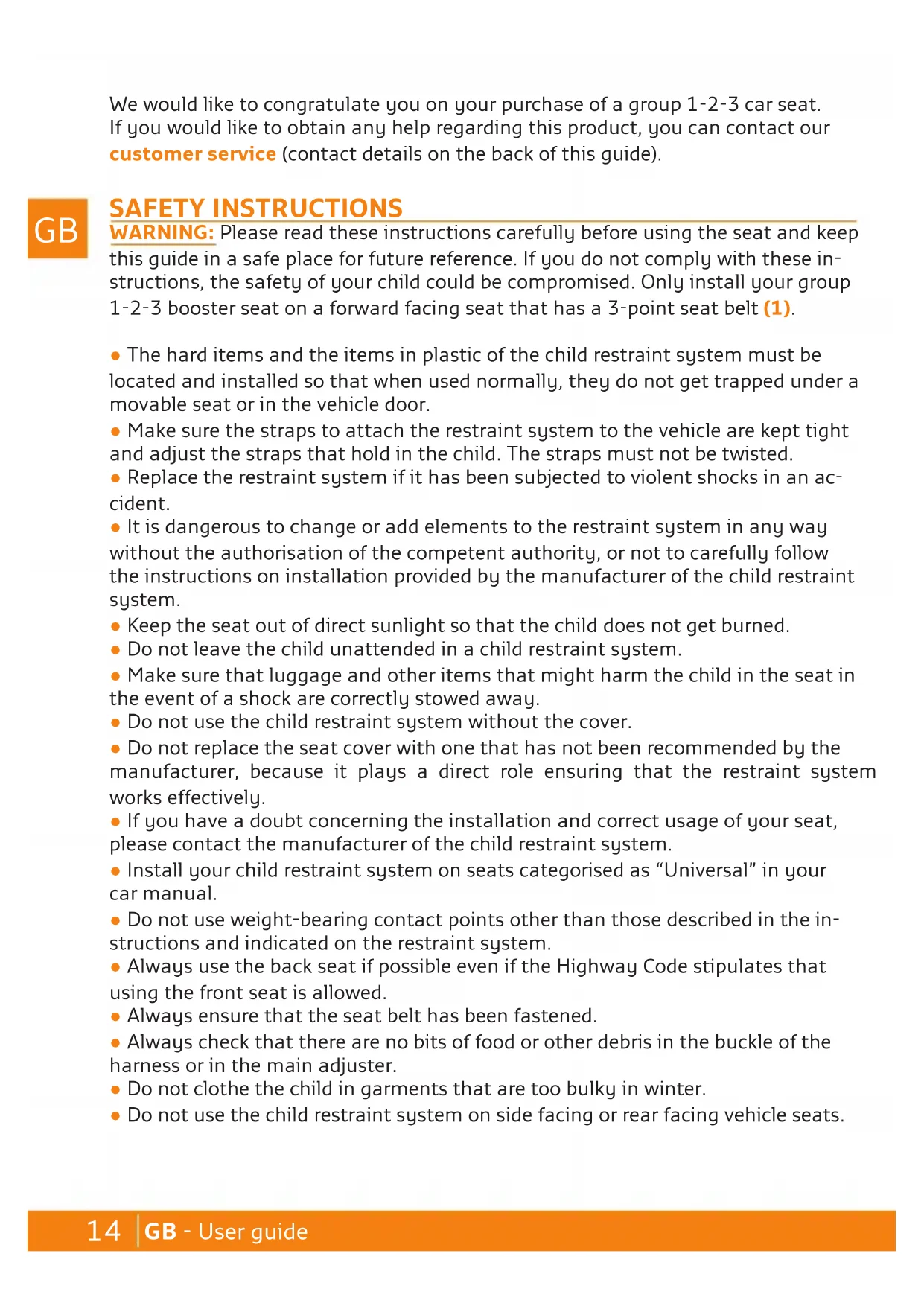 We would like to congratulate you on your purchase of a group 1-2-3 car seat. If you would like to obtain any help regarding this product, you can contact our customer service (contact details on the back of this guide). SAFETY INSTRUCTIONS