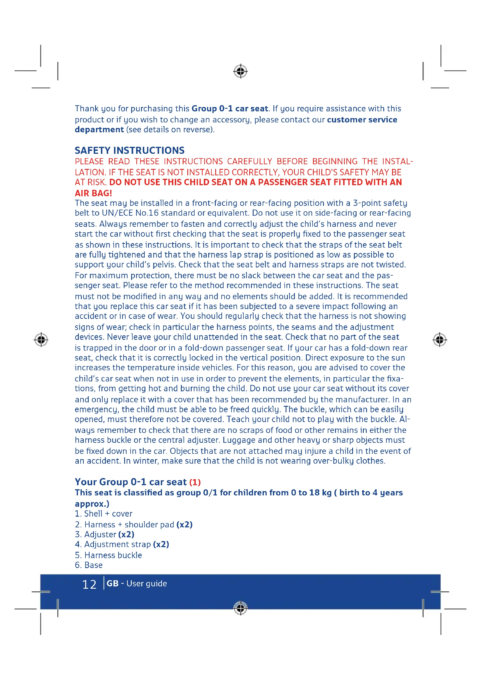 deur.12 GB - User guide Thank you for purchasing this Group 0-1 car seat. If you require assistance with this product or if you wish to change an accessory, please contact our customer service department (see details on reverse). SAFETY INSTRUCTIONS PLEASE READ THESE INSTRUCTIONS CAREFULLY BEFORE BEGINNING THE INSTAL- LATION. IF THE SEAT IS NOT INSTALLED CORRECTLY, YOUR CHILD’S SAFETY MAY BE AT RISK. DO NOT USE THIS CHILD SEAT ON A PASSENGER SEAT FITTED WITH AN AIR BAG! The seat may be installed in a front-facing or rear-facing position with a 3-point safety belt to UN/ECE No.16 standard or equivalent. Do not use it on side-facing or rear-facing seats. Always remember to fasten and correctly adjust the child’s harness and never start the car without first checking that the seat is properly fixed to the passenger seat as shown in these instructions. It is important to check that the straps of the seat belt are fully tightened and that the harness lap strap is positioned as low as possible to support your child’s pelvis. Check that the seat belt and harness straps are not twisted. For maximum protection, there must be no slack between the car seat and the pas- senger seat. Please refer to the method recommended in these instructions. The seat must not be modified in any way and no elements should be added. It is recommended that you replace this car seat if it has been subjected to a severe impact following an accident or in case of wear. You should regularly check that the harness is not showing signs of wear; check in particular the harness points, the seams and the adjustment devices. Never leave your child unattended in the seat. Check that no part of the seat is trapped in the door or in a fold-down passenger seat. If your car has a fold-down rear seat, check that it is correctly locked in the vertical position. Direct exposure to the sun increases the temperature inside vehicles. For this reason, you are advised to cover the child’s car seat when not in use in order to prevent the elements, in particular the fixa- tions, from getting hot and burning the child. Do not use your car seat without its cover and only replace it with a cover that has been recommended by the manufacturer. In an emergency, the child must be able to be freed quickly. The buckle, which can be easily opened, must therefore not be covered. Teach your child not to play with the buckle. Al- ways remember to check that there are no scraps of food or other remains in either the harness buckle or the central adjuster. Luggage and other heavy or sharp objects must be fixed down in the car. Objects that are not attached may injure a child in the event of an accident. In winter, make sure that the child is not wearing over-bulky clothes. Your Group 0-1 car seat (1) This seat is classified as group 0/1 for children from 0 to 18 kg ( birth to 4 years approx.)
