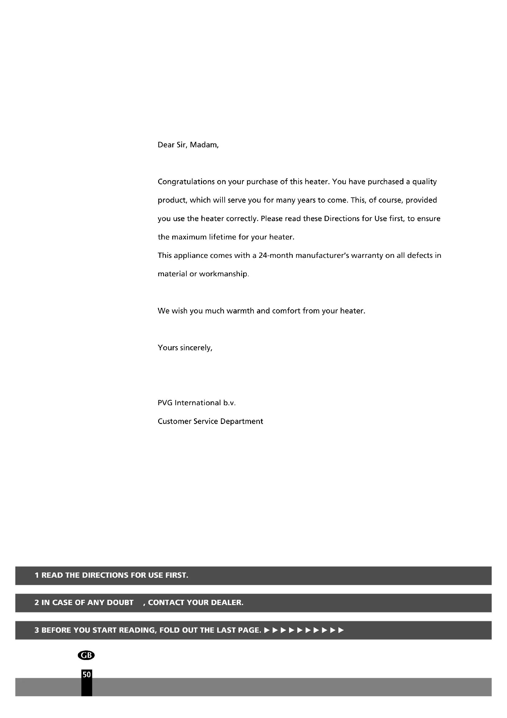 18a 18b 18dDear Sir, Madam, Congratulations on your purchase of this heater. You have purchased a quality product, which will serve you for many years to come. This, of course, provided you use the heater correctly. Please read these Directions for Use first, to ensure the maximum lifetime for your heater. This appliance comes with a 24-month manufacturer’s warranty on all defects in material or workmanship. We wish you much warmth and comfort from your heater. Yours sincerely, PVG International b.v. Customer Service Department 1 READ THE DIRECTIONS FOR USE FIRST.