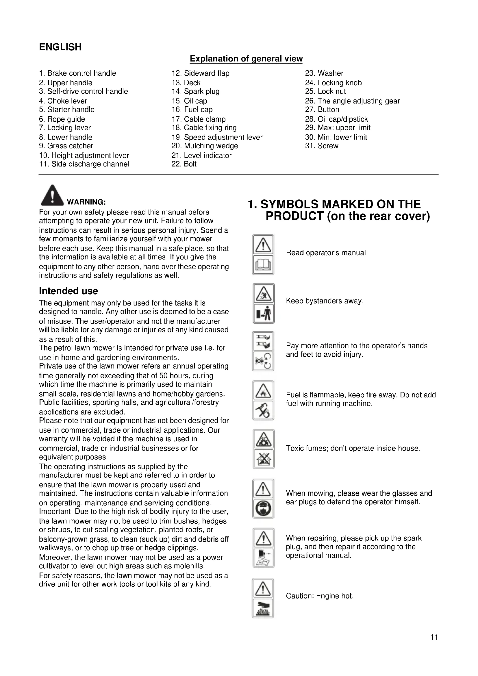 For your own safety please read this manual before attempting to operate your new unit. Failure to follow instructions can result in serious personal injury. Spend a few moments to familiarize yourself with your mower before each use. Keep this manual in a safe place, so that the information is available at all times. If you give the equipment to any other person, hand over these operating instructions and safety regulations as well. Intended use The equipment may only be used for the tasks it is designed to handle. Any other use is deemed to be a case of misuse. The user/operator and not the manufacturer will be liable for any damage or injuries of any kind caused as a result of this. The petrol lawn mower is intended for private use i.e. for use in home and gardening environments. Private use of the lawn mower refers an annual operating time generally not exceeding that of 50 hours, during which time the machine is primarily used to maintain small-scale, residential lawns and home/hobby gardens. Public facilities, sporting halls, and agricultural/forestry applications are excluded. Please note that our equipment has not been designed for use in commercial, trade or industrial applications. Our warranty will be voided if the machine is used in commercial, trade or industrial businesses or for equivalent purposes. The operating instructions as supplied by the manufacturer must be kept and referred to in order to ensure that the lawn mower is properly used and maintained. The instructions contain valuable information on operating, maintenance and servicing conditions. Important! Due to the high risk of bodily injury to the user, the lawn mower may not be used to trim bushes, hedges or shrubs, to cut scaling vegetation, planted roofs, or balcony-grown grass, to clean (suck up) dirt and debris off walkways, or to chop up tree or hedge clippings. Moreover, the lawn mower may not be used as a power cultivator to level out high areas such as molehills. For safety reasons, the lawn mower may not be used as a drive unit for other work tools or tool kits of any kind.