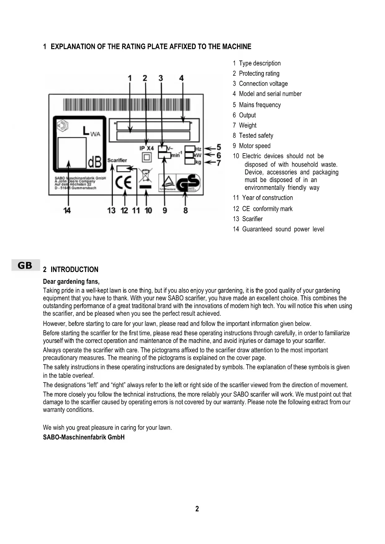 2 INTRODUCTION Dear gardening fans, Taking pride in a well-kept lawn is one thing, but if you also enjoy your gardening, it is the good quality of your gardening equipment that you have to thank. With your new SABO scarifier, you have made an excellent choice. This combines the outstanding performance of a great traditional brand with the innovations of modern high tech. You will notice this when using the scarifier, and be pleased when you see the perfect result achieved. However, before starting to care for your lawn, please read and follow the important information given below. Before starting the scarifier for the first time, please read these operating instructions through carefully, in order to familiarize yourself with the correct operation and maintenance of the machine, and avoid injuries or damage to your scarifier. Always operate the scarifier with care. The pictograms affixed to the scarifier draw attention to the most important precautionary measures. The meaning of the pictograms is explained on the cover page. The safety instructions in these operating instructions are designated by symbols. The explanation of these symbols is given in the table overleaf. The designations “left” and “right” always refer to the left or right side of the scarifier viewed from the direction of movement. The more closely you follow the technical instructions, the more reliably your SABO scarifier will work. We must point out that damage to the scarifier caused by operating errors is not covered by our warranty. Please note the following extract from our warranty conditions. We wish you great pleasure in caring for your lawn. SABO-Maschinenfabrik GmbH3