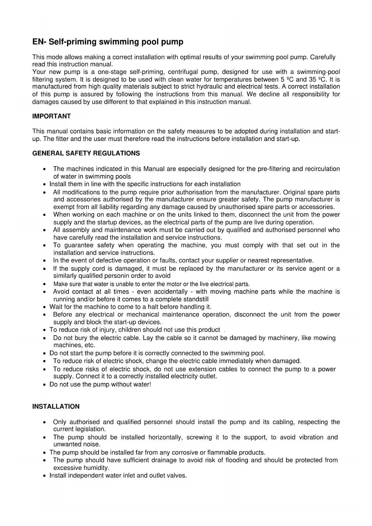 Your new pump is a one-stage self-priming, centrifugal pump, designed for use with a swimming-pool filtering system. It is designed to be used with clean water for temperatures between 5^ and 35^ . It is manufactured from high quality materials subject to strict hydraulic and electrical tests. A correct installation of this pump is assured by following the instructions from this manual. We decline all responsibility for damages caused by use different to that explained in this instruction manual.