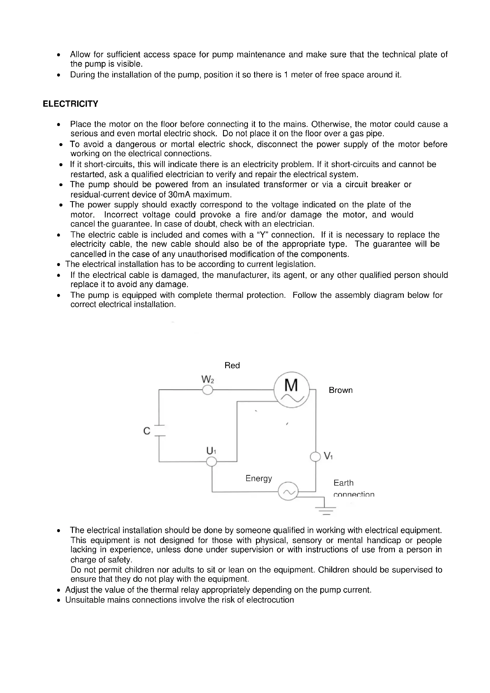 - The pump is equipped with complete thermal protection. Follow the assembly diagram below for correct electrical installation.