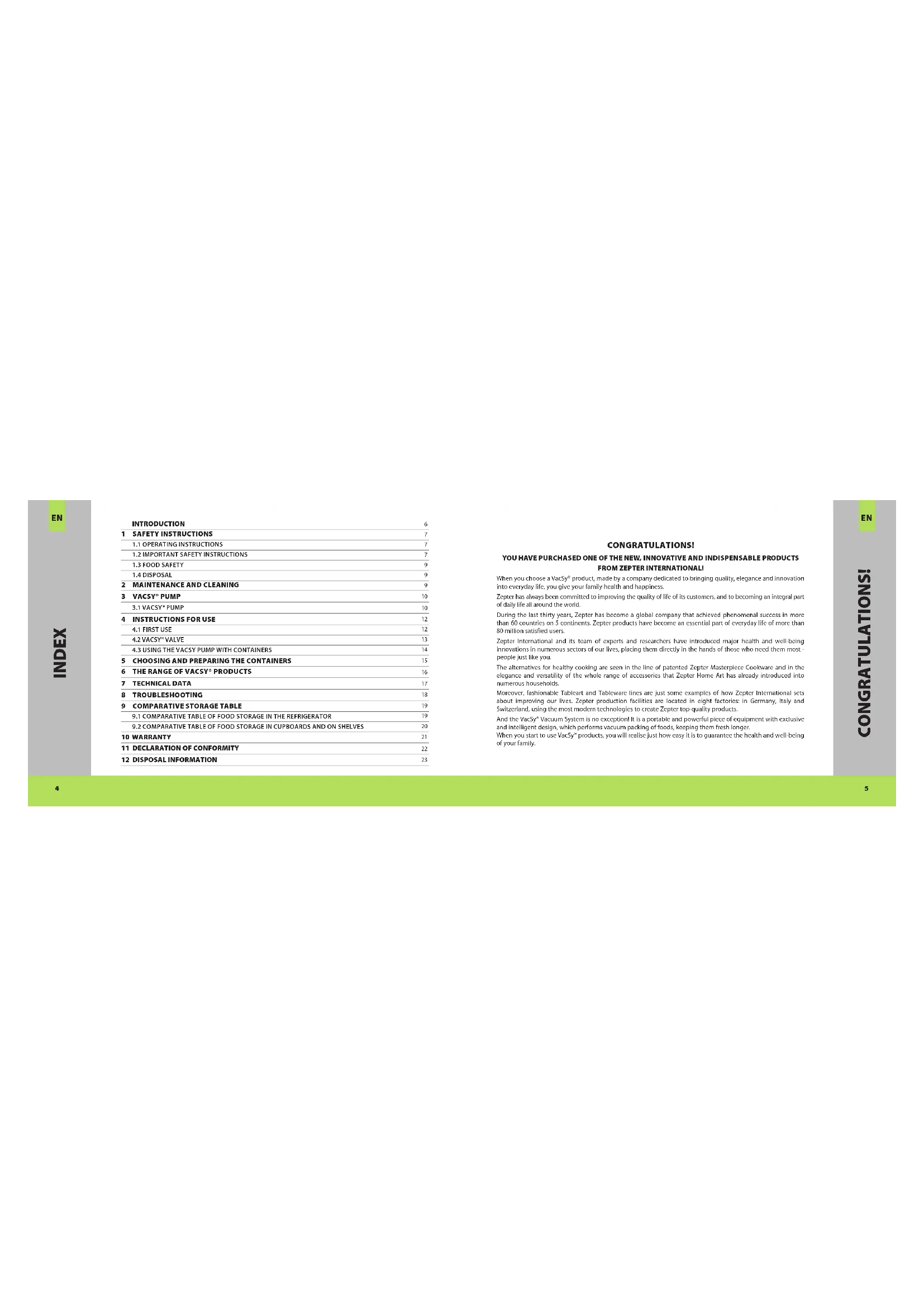 INDEX76 EN EN VACSY®: THE REVOLUTIONARY VACUUM SYSTEM AND ITS ELEMENTS Discover how incredibly easy it is to use the VacSy® Vacuum System - and how great the benefits are! The VacSy Pump allows vacuum packing fresh or cooked food, with a complete range of food-safe containers. Extremely practical and versatile, it keeps food fresh longer and the refrigerator odour free. The VacSy® Vacuum System preserves food's organoleptic qualities and vitamin content by stopping all chemical (oxidation) and biological (microorganisms) damage and preserving food in its initial condition. Before using the VacSy® Vacuum System for the first time, read this instruction manual. Keep these instructions for further reference. The user manual is available for download from www.zepter.com INTRODUCTION