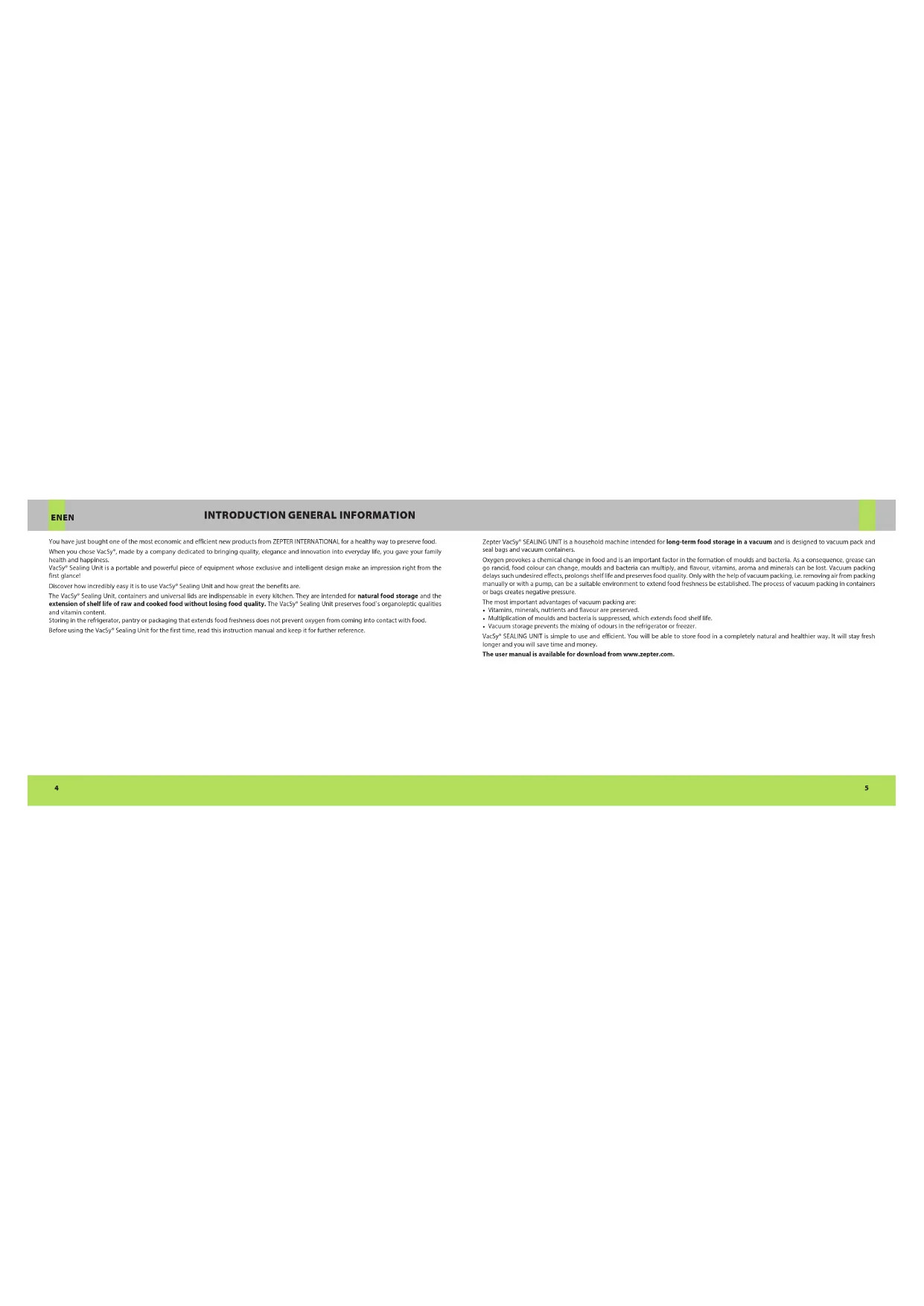 EN EN You have just bought one of the most economic and efficient new products from ZEPTER INTERNATIONAL for a healthy way to preserve food. When you chose VacSy®, made by a company dedicated to bringing quality, elegance and innovation into everyday life, you gave your family health and happiness. VacSy® Sealing Unit is a portable and powerful piece of equipment whose exclusive and intelligent design make an impression right from the first glance! Discover how incredibly easy it is to use VacSy® Sealing Unit and how great the benefits are. The VacSy® Sealing Unit, containers and universal lids are indispensable in every kitchen. They are intended for natural food storage and the extension of shelf life of raw and cooked food without losing food quality. The VacSy® Sealing Unit preserves food`s organoleptic qualities and vitamin content. Storing in the refrigerator, pantry or packaging that extends food freshness does not prevent oxygen from coming into contact with food. Before using the VacSy® Sealing Unit for the first time, read this instruction manual and keep it for further reference.