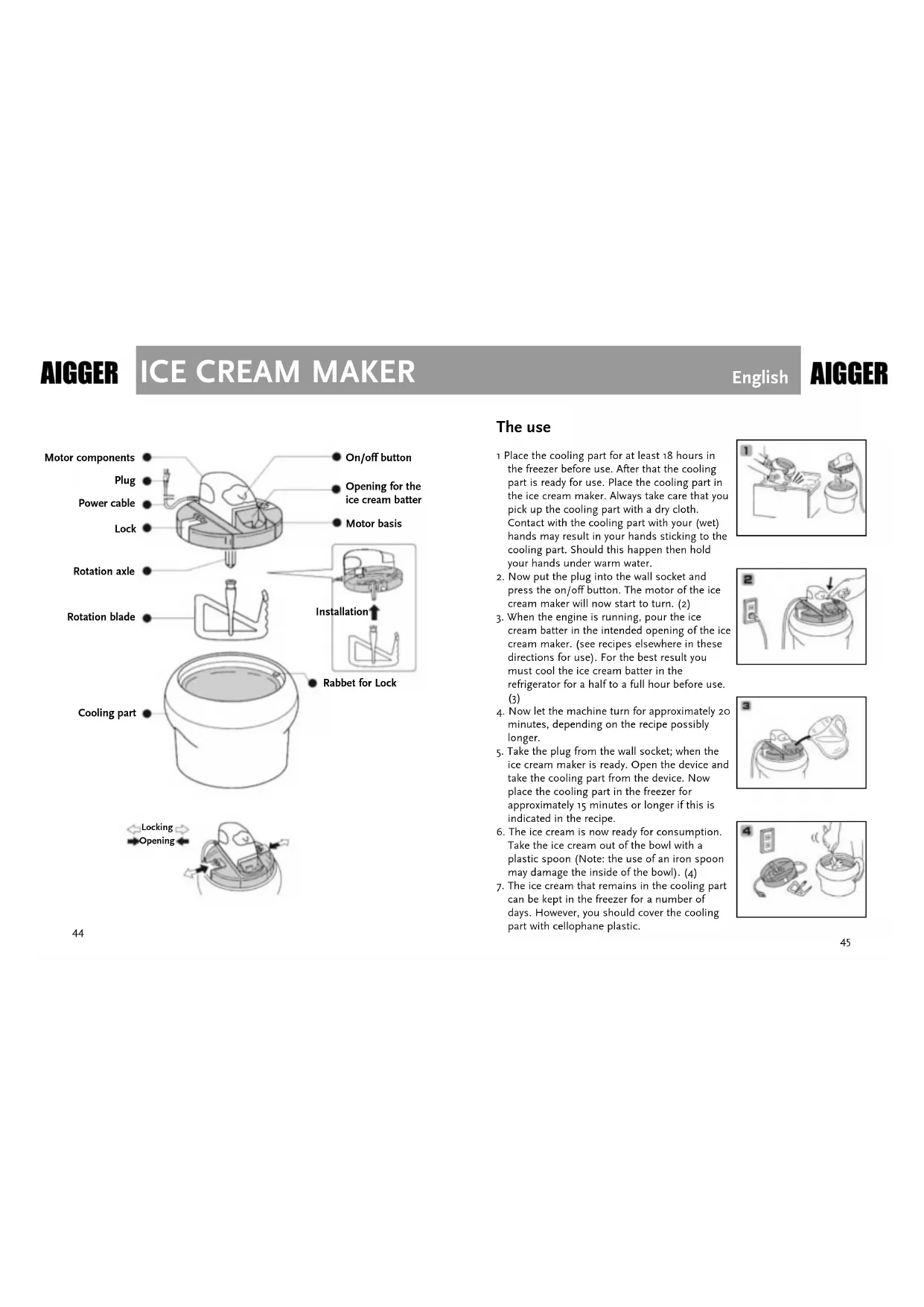 Motor components Plug Power cable Lock Rotation axle On/off button Opening for the ice cream batter Motor basis Rabbet for Lock Installation Rotation blade Cooling part Locking Opening English- When you want to attach the transparent part to the motor component again, you must take care that the rotation axle is attached again simultaneously. - The rotation axle must be locked, the middle slit of the rotation axle falls between the transparent part and the motor component. -You can slide the whole into each other again. The motor must not be immersed in water like the other components! Clean the motor of the ice cream maker by means of a moist cloth. Always first take the plug off the wall socket before you clean the motor. Recipes Lemon sorbet Ingredients: 4 lemon juice - 200 gr sugar - 30 cl water Method of preparation: Grate the peel of 3 of the lemons and squeeze them all. Allow the sugar to dissolve in the heated water and then add the shredded peel, which you have allowed to stew for 10 minutes. After that you add the juice of all the lemons and let it cool down. Pour the whole into the ice cream maker and turn approx. 35 minutes until it is ice cream. Place the whole after the preparation in the ice cream maker in the freezer for approximately half an hour. Serving tips: Put some balls in a flat champagne glass and sprinkle with shredded fresh mint.