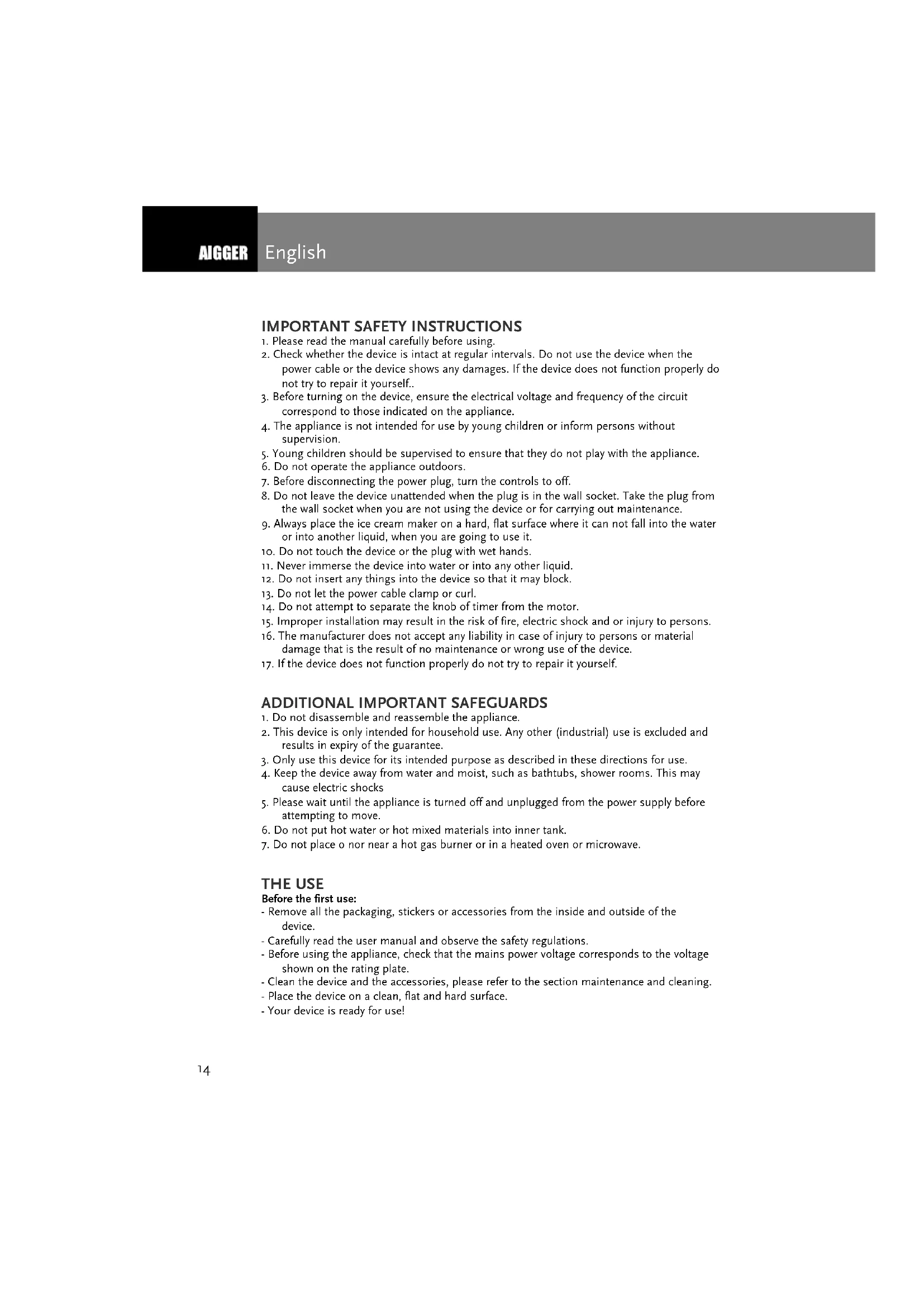 THE USE Before the first use: - Remove all the packaging, stickers or accessories from the inside and outside of the device. - Carefully read the user manual and observe the safety regulations. - Before using the appliance, check that the mains power voltage corresponds to the voltage shown on the rating plate. - Clean the device and the accessories, please refer to the section maintenance and cleaning. - Place the device on a clean, flat and hard surface. - Your device is ready for use!15 Know your parts