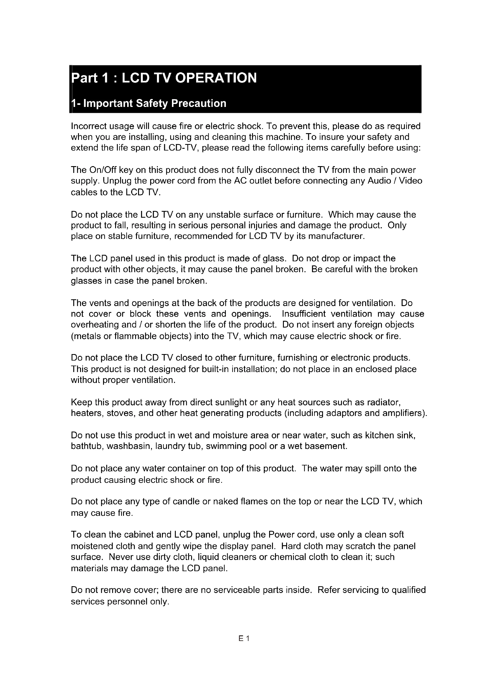 Incorrect usage will cause fire or electric shock. To prevent this, please do as required when you are installing, using and cleaning this machine. To insure your safety and extend the life span of LCD-TV, please read the following items carefully before using: The On/Off key on this product does not fully disconnect the TV from the main power supply. Unplug the power cord from the AC outlet before connecting any Audio / Video cables to the LCD TV. Do not place the LCD TV on any unstable surface or furniture. Which may cause the product to fall, resulting in serious personal injuries and damage the product. Only place on stable furniture, recommended for LCD TV by its manufacturer. The LCD panel used in this product is made of glass. Do not drop or impact the product with other objects, it may cause the panel broken. Be careful with the broken glasses in case the panel broken. The vents and openings at the back of the products are designed for ventilation. Do not cover or block these vents and openings. Insufficient ventilation may cause overheating and / or shorten the life of the product. Do not insert any foreign objects (metals or flammable objects) into the TV, which may cause electric shock or fire. Do not place the LCD TV closed to other furniture, furnishing or electronic products. This product is not designed for built-in installation; do not place in an enclosed place without proper ventilation. Keep this product away from direct sunlight or any heat sources such as radiator, heaters, stoves, and other heat generating products (including adaptors and amplifiers). Do not use this product in wet and moisture area or near water, such as kitchen sink, bathtub, washbasin, laundry tub, swimming pool or a wet basement. Do not place any water container on top of this product. The water may spill onto the product causing electric shock or fire. Do not place any type of candle or naked flames on the top or near the LCD TV, which may cause fire. To clean the cabinet and LCD panel, unplug the Power cord, use only a clean soft moistened cloth and gently wipe the display panel. Hard cloth may scratch the panel surface. Never use dirty cloth, liquid cleaners or chemical cloth to clean it; such materials may damage the LCD panel. Do not remove cover; there are no serviceable parts inside. Refer servicing to qualified services personnel only. E 12- Main functions