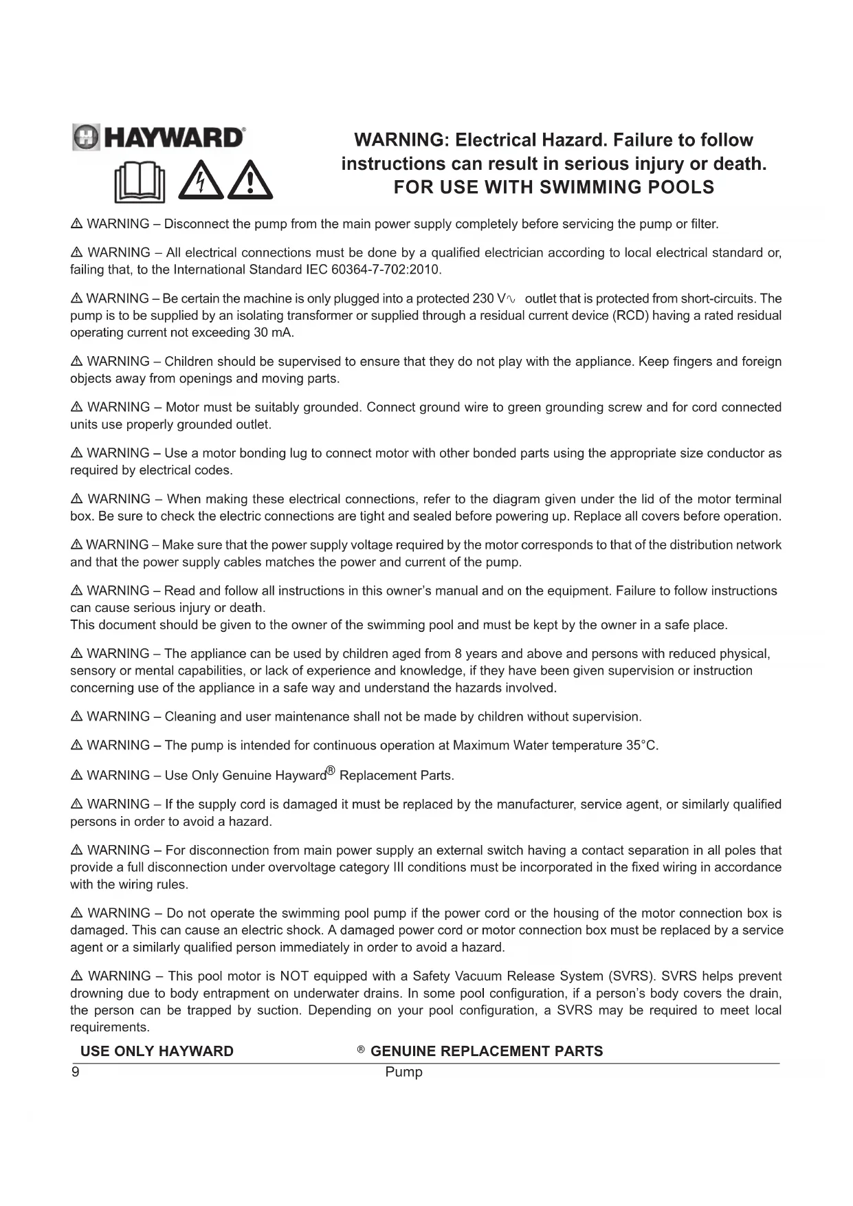 - WARNING – Use Only Genuine Hayward