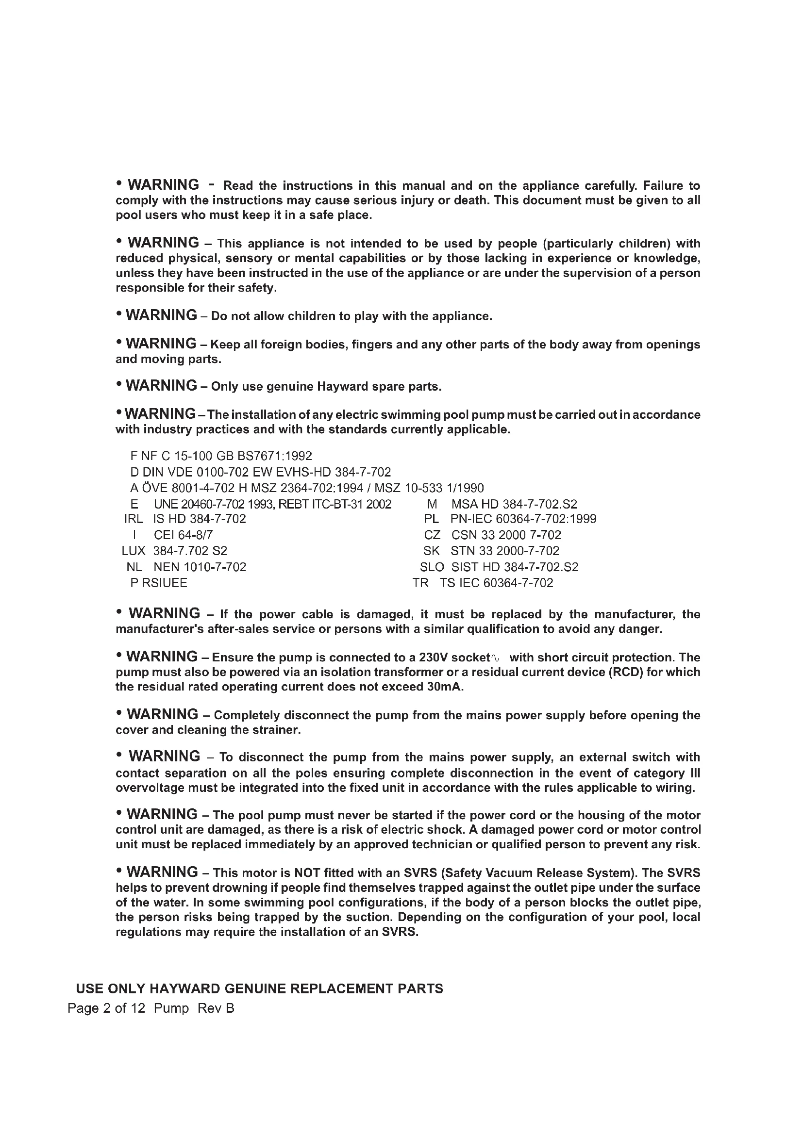 - WARNING – This motor is NOT fitted with an SVRS (Safety Vacuum Release System). The SVRS helps to prevent drowning if people find themselves trapped against the outlet pipe under the surface of the water. In some swimming pool configurations, if the body of a person blocks the outlet pipe, the person risks being trapped by the suction. Depending on the configuration of your pool, local regulations may require the installation of an SVRS.USE ONLY HAYWARD GENUINE REPLACEMENT PARTS Page 3 of 12 Pump Rev B GENERAL POINTS Congratulations, you have just acquired a Hayward variable speed pump