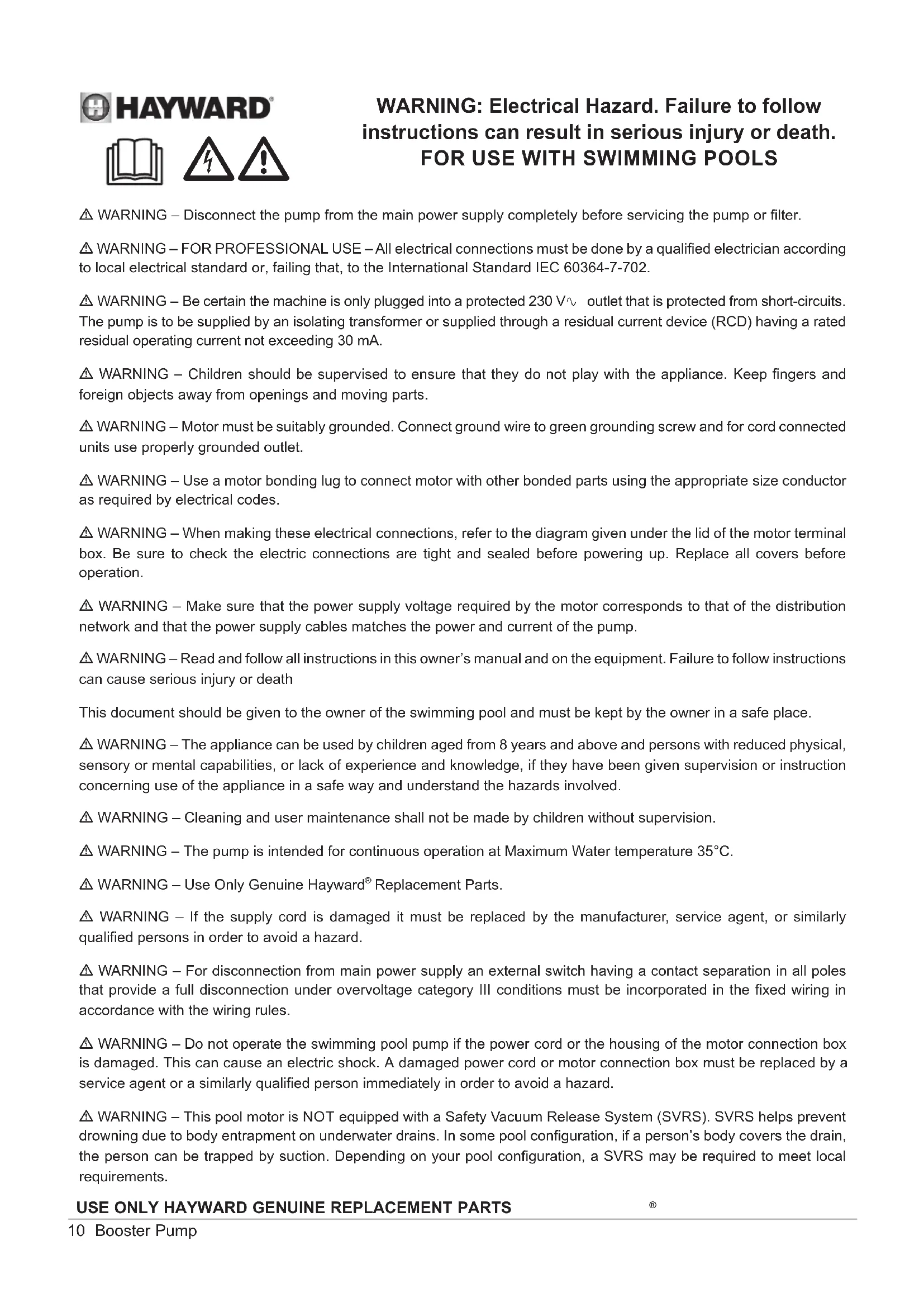 Download the instructions for your Pump in PDF format for free! Find your manual Booster - HAYWARD and take your electronic device back in hand. On this page are published all the documents necessary for the use of your device. Booster by HAYWARD.