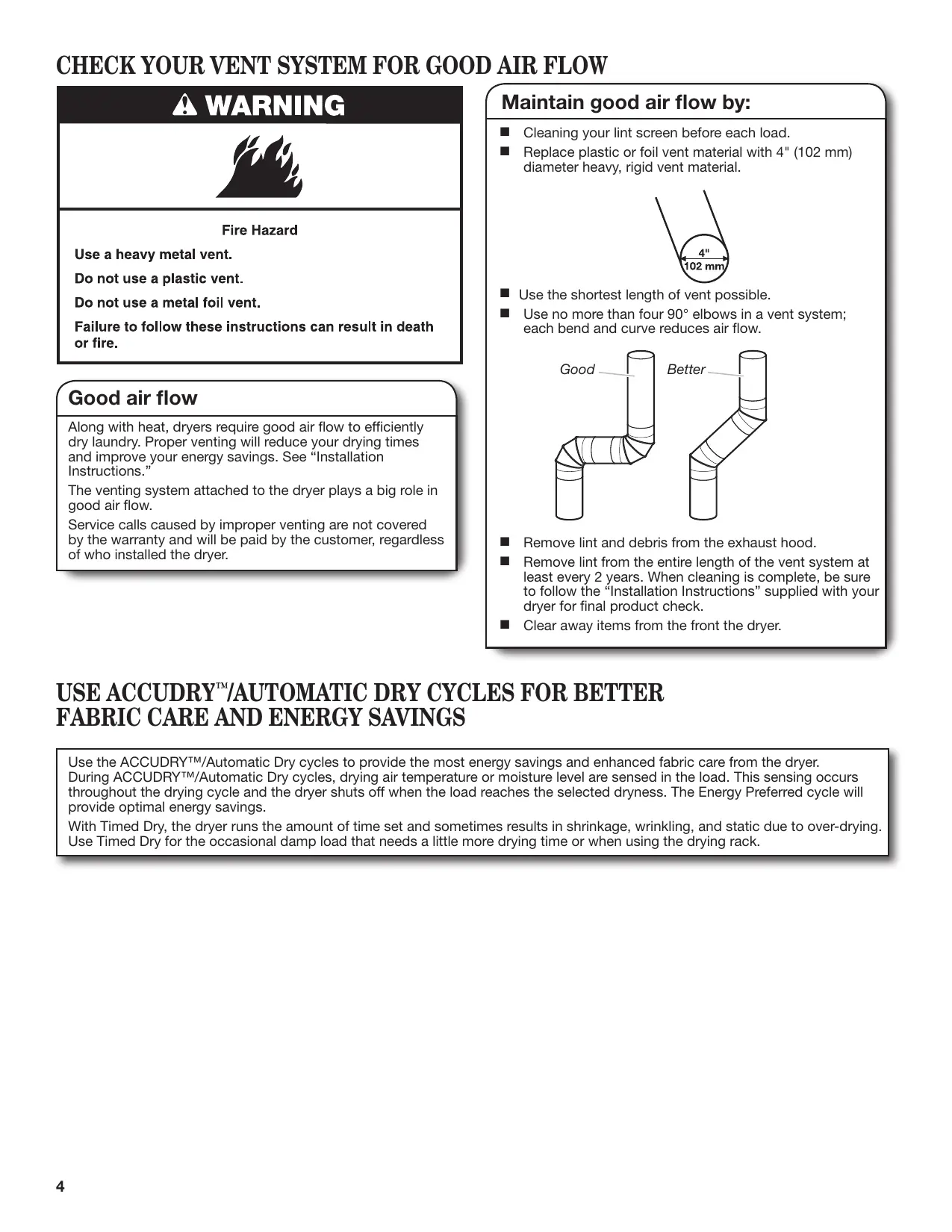 Cleaning your lint screen before each load. Replace plastic or foil vent material with 4" (102 mm) diameter heavy, rigid vent material. n Use the shortest length of vent possible. n Use no more than four 90° elbows in a vent system; each bend and curve reduces air flow. Good Better Good air flow Along with heat, dryers require good air flow to efficiently dry laundry. Proper venting will reduce your drying times and improve your energy savings. See “Installation Instructions.” The venting system attached to the dryer plays a big role in good air flow. Service calls caused by improper venting are not covered by the warranty and will be paid by the customer, regardless of who installed the dryer. Remove lint and debris from the exhaust hood. Remove lint from the entire length of the vent system at least every 2 years. When cleaning is complete, be sure to follow the “Installation Instructions” supplied with your dryer for final product check. n Clear away items from the front the dryer.