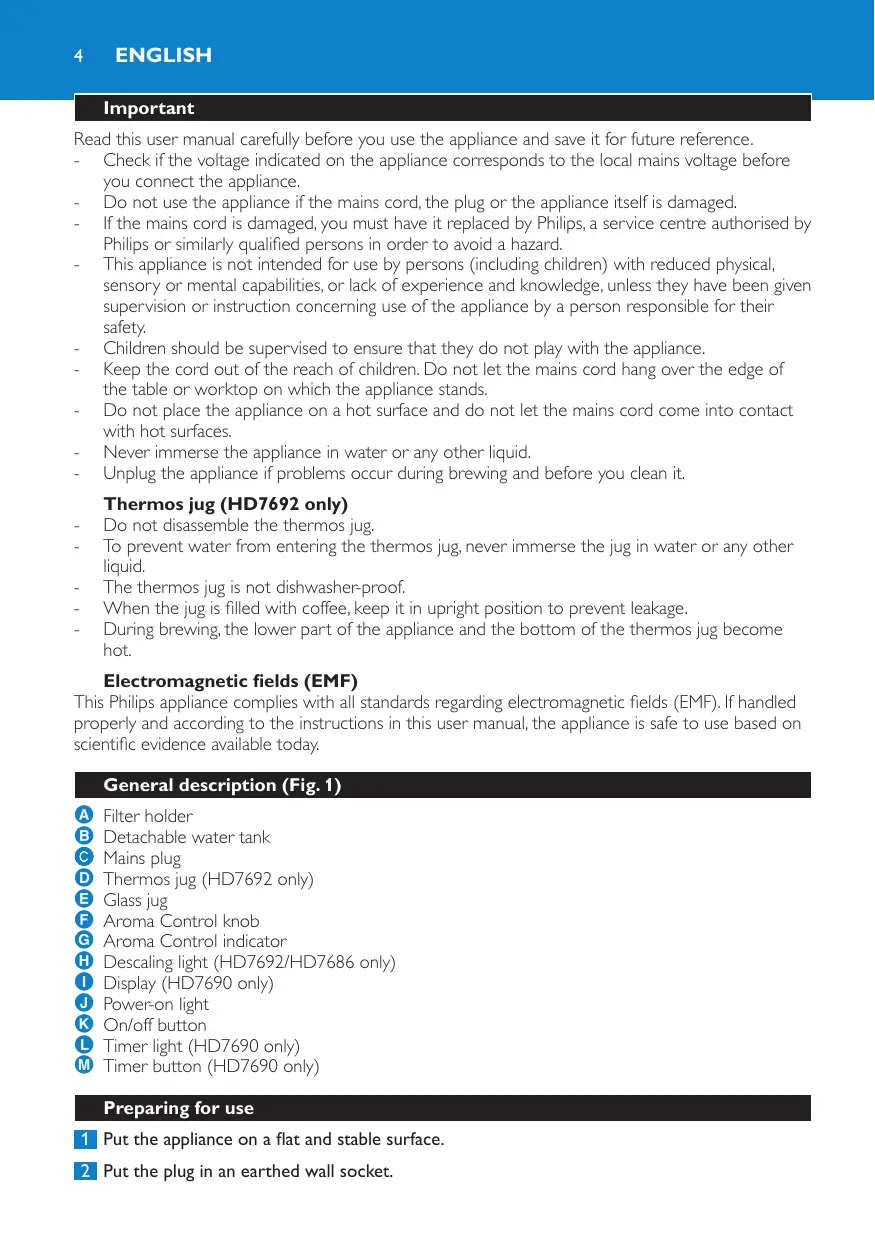 Read this user manual carefully before you use the appliance and save it for future reference. - Check if the voltage indicated on the appliance corresponds to the local mains voltage before you connect the appliance. - Do not use the appliance if the mains cord, the plug or the appliance itself is damaged. - If the mains cord is damaged, you must have it replaced by Philips, a service centre authorised by Philips or similarly qualified persons in order to avoid a hazard. - This appliance is not intended for use by persons (including children) with reduced physical, sensory or mental capabilities, or lack of experience and knowledge, unless they have been given supervision or instruction concerning use of the appliance by a person responsible for their safety. - Children should be supervised to ensure that they do not play with the appliance. - Keep the cord out of the reach of children. Do not let the mains cord hang over the edge of the table or worktop on which the appliance stands. - Do not place the appliance on a hot surface and do not let the mains cord come into contact with hot surfaces. - Never immerse the appliance in water or any other liquid. - Unplug the appliance if problems occur during brewing and before you clean it. Thermos jug (HD7692 only) Do not disassemble the thermos jug. To prevent water from entering the thermos jug, never immerse the jug in water or any other liquid. The thermos jug is not dishwasher-proof. When the jug is filled with coffee, keep it in upright position to prevent leakage. During brewing, the lower part of the appliance and the bottom of the thermos jug become hot.