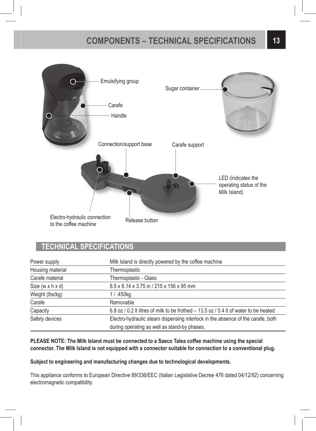 PLEASE NOTE: The Milk Island must be connected to a Saeco Talea coffee machine using the special connector. The Milk Island is not equipped with a connector suitable for connection to a conventional plug.