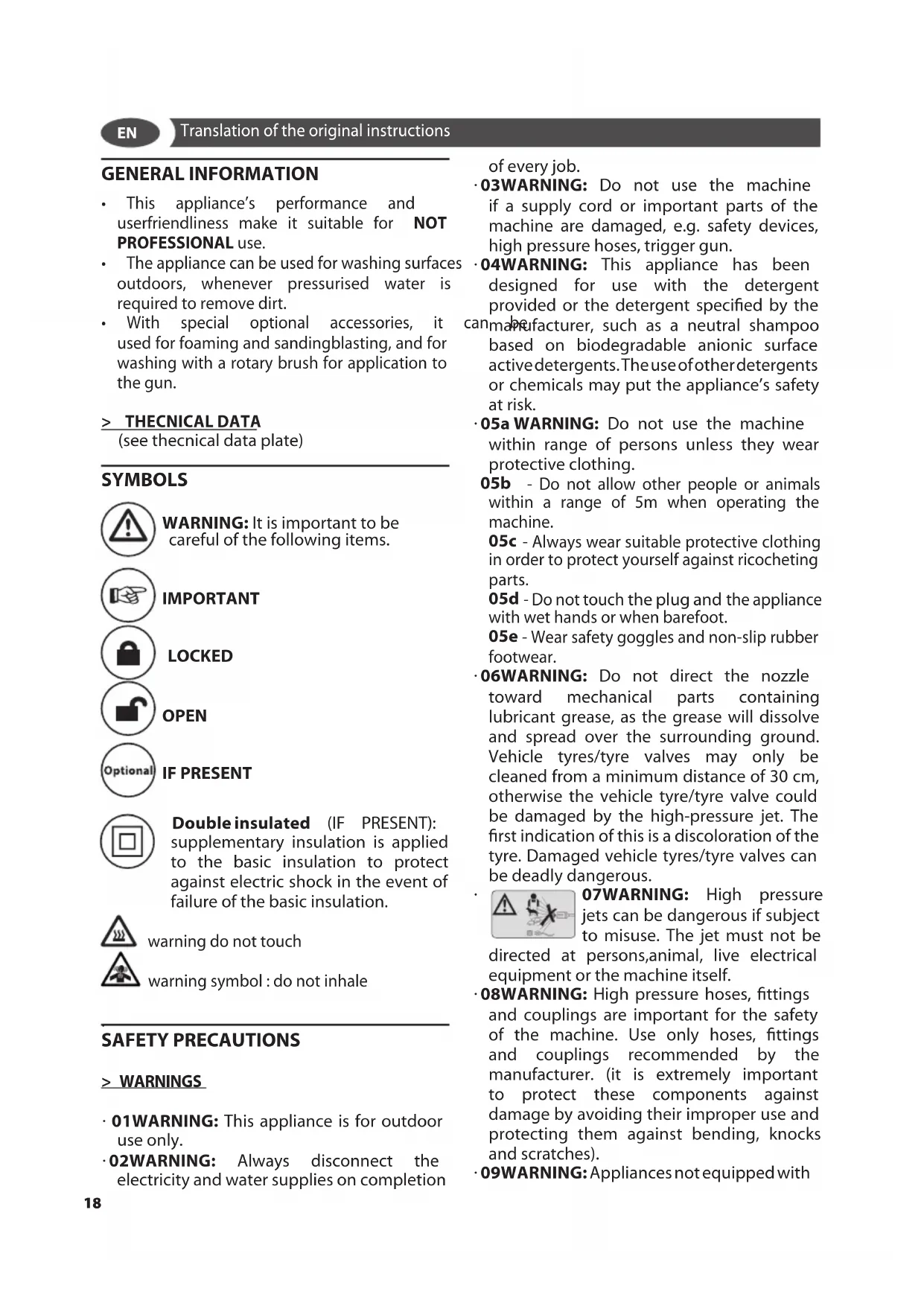 07WARNING: High pressure jets can be dangerous if subject to misuse. The jet must not be directed at persons,animal, live electrical equipment or the machine itself.