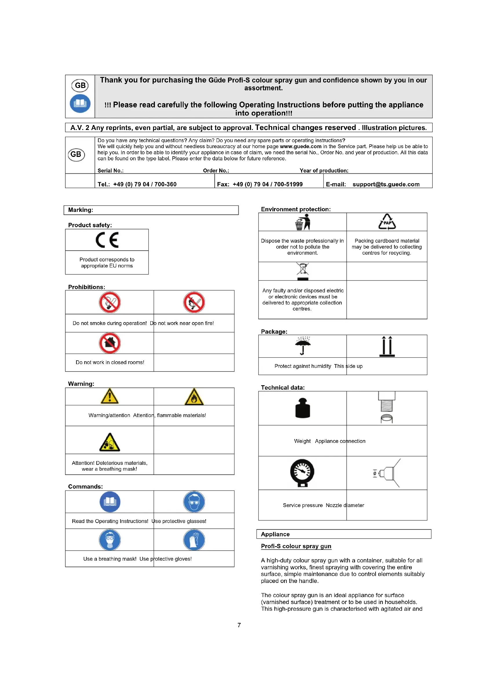 6GB Thank you for purchasing the Güde Profi-S colour spray gun and confidence shown by you in our assortment. !!! Please read carefully the following Operating Instructions before putting the appliance into operation!!! A.V. 2 Any reprints, even partial, are subject to approval. Technical changes reserved . Illustration pictures.