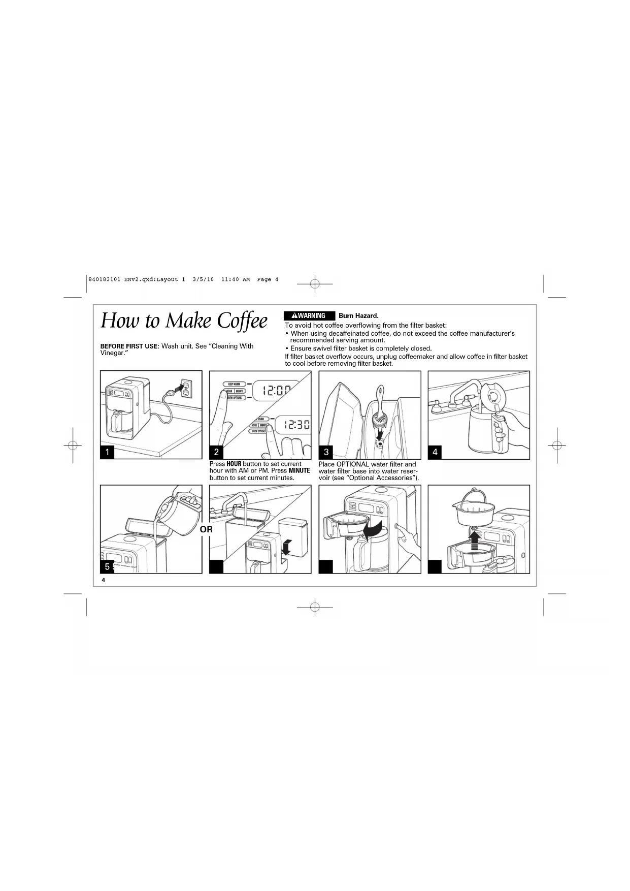 - Ensure swivel filter basket is completely closed. If filter basket overflow occurs, unplug coffeemaker and allow coffee in filter basket to cool before removing filter basket. w WARNING BEFORE FIRST USE: Wash unit. See “Cleaning With Vinegar.” Place OPTIONAL water filter and water filter base into water reser- voir (see “Optional Accessories”).