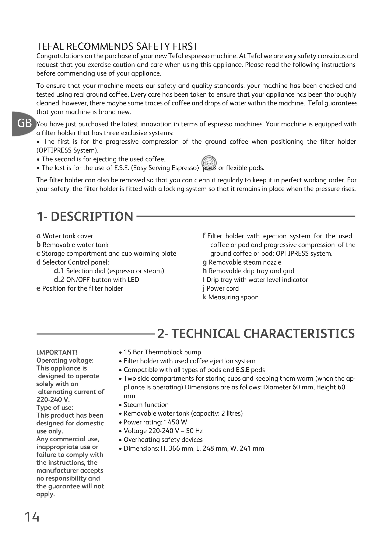 Congratulations on the purchase of your new Tefal espresso machine. At Tefal we are very safety conscious andrequest that you exercise caution and care when using this appliance. Please read the following instructionsbefore commencing use of your appliance.To ensure that your machine meets our safety and quality standards, your machine has been checked andtested using real ground coffee. Every care has been taken to ensure that your appliance has been thoroughlycleaned, however, there maybe some traces of coffee and drops of water within the machine. Tefal guaranteesthat your machine is brand new.You have just purchased the latest innovation in terms of espresso machines. Your machine is equipped witha filter holder that has three exclusive systems:• The first is for the progressive compression of the ground coffee when positioning the filter holder(OPTIPRESS System).• The second is for ejecting the used coffee.• The last is for the use of E.S.E. (Easy Serving Espresso) pods or flexible pods.The filter holder can also be removed so that you can clean it regularly to keep it in perfect working order. Foryour safety, the filter holder is fitted with a locking system so that it remains in place when the pressure rises.