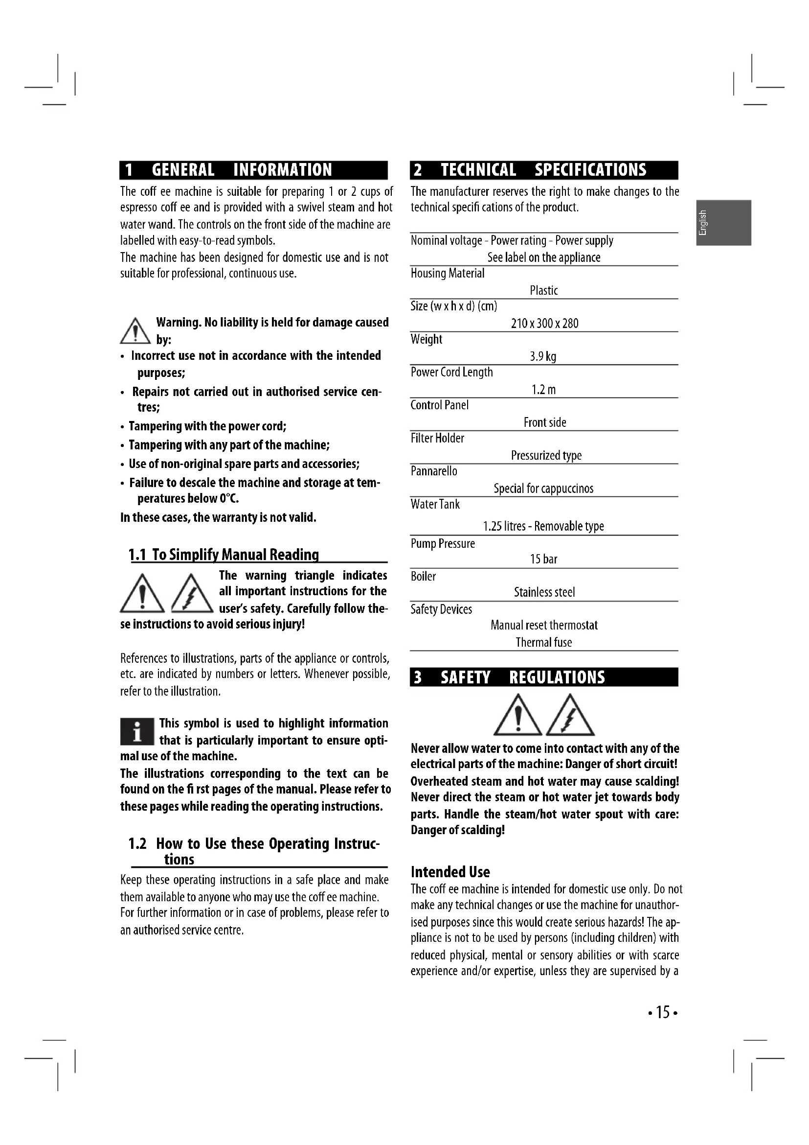 Pump Pressure 15 bar Boiler Stainless steel Safety Devices Manual reset thermostat Thermal fuse 3 SAFETY REGULATIONS Never allow water to come into contact with any of the electrical parts of the machine: Danger of short circuit! Overheated steam and hot water may cause scalding! Never direct the steam or hot water jet towards body parts. Handle the steam/hot water spout with care: Danger of scalding! Intended Use The co ee machine is intended for domestic use only. Do not make any technical changes or use the machine for unauthor- ised purposes since this would create serious hazards! The ap- pliance is not to be used by persons (including children) with reduced physical, mental or sensory abilities or with scarce experience and/or expertise, unless they are supervised by a• 16 • person responsible for their safety, or they are instructed by this person on how to properly use the machine. Power Supply Connect the co ee machine only to a suitable socket. The volt- age must correspond to that indicated on the appliance label. Power Cord Never use the co ee machine if the power cord is defective or damaged. If the power cord is damaged, it must be replaced by the manufacturer or by its authorised service centre. Do not pass the power cord around corners, over sharp edges or over hot objects and keep it away from oil. Do not use the power cord to carry or pull the co ee machine. Do not pull out the plug by the power cord or touch it with wet hands. Do not let the power cord hang freely from tables or shelves. For the Safety of Others Prevent children from playing with the machine. Children are not aware of the risks related to electrical house- hold appliances. Do not leave the machine packaging materials within the reach of children. Danger of Burns Never direct jets of overheated steam and/or hot water towards yourself or others. Always use the handles or knobs provided. Do not disconnect (remove) the lter holder during co ee brewing. Hot water drips may spill out of the brew unit during the warm-up phase. Never brew co ee when button ( ) is pressed because this means that the steam function is on and the temperature of the boiler is too high. Location Place the co ee machine in a safe place, where there will be no danger of overturning or injury. Hot water or overheated steam may spill out of the machine: Danger of scalding! Do not keep the machine at a temperature below 0°C. Frost may damage it. Do not use the co ee machine outdoors. In order to prevent its housing from melting or being dam- aged, do not place the machine on very hot surfaces and close to open ames. Cleaning Before cleaning the machine it is necessary to turn o all but- tons and then remove the plug from the socket. Wait for the machine to cool down. Never immerse the ma- chine in water! It is strictly forbidden to tamper with the internal parts of the machine. Water left in the tank for several days should not be consumed. Wash the tank and ll it with fresh drinking water. Suitable Location for Operation and Mainte- nance To ensure a correct and e cient performance of the co ee ma- chine, we recommend following the instructions below: