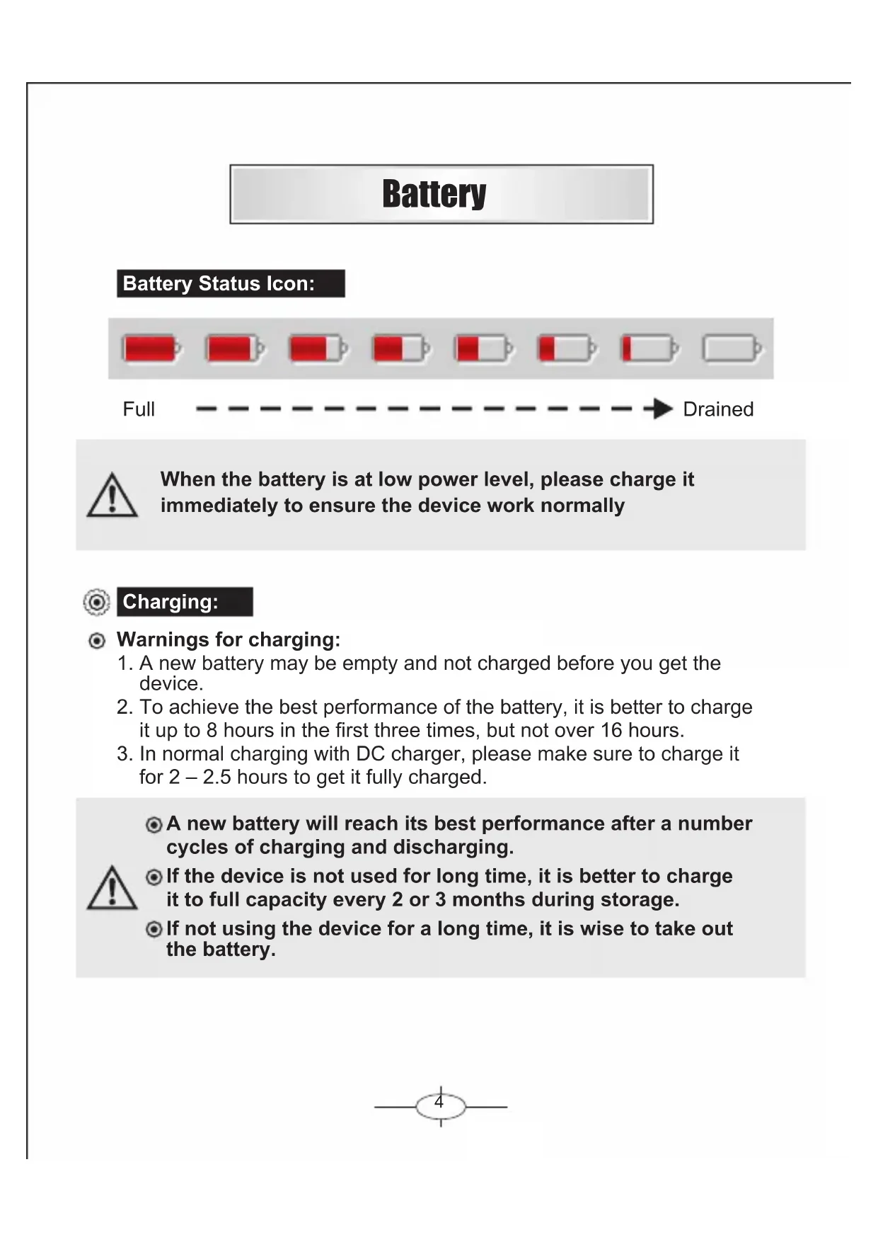 Battery Status Icon: Full Drained When the battery is at low power level, please charge it immediately to ensure the device work normally Charging: Warnings for charging: