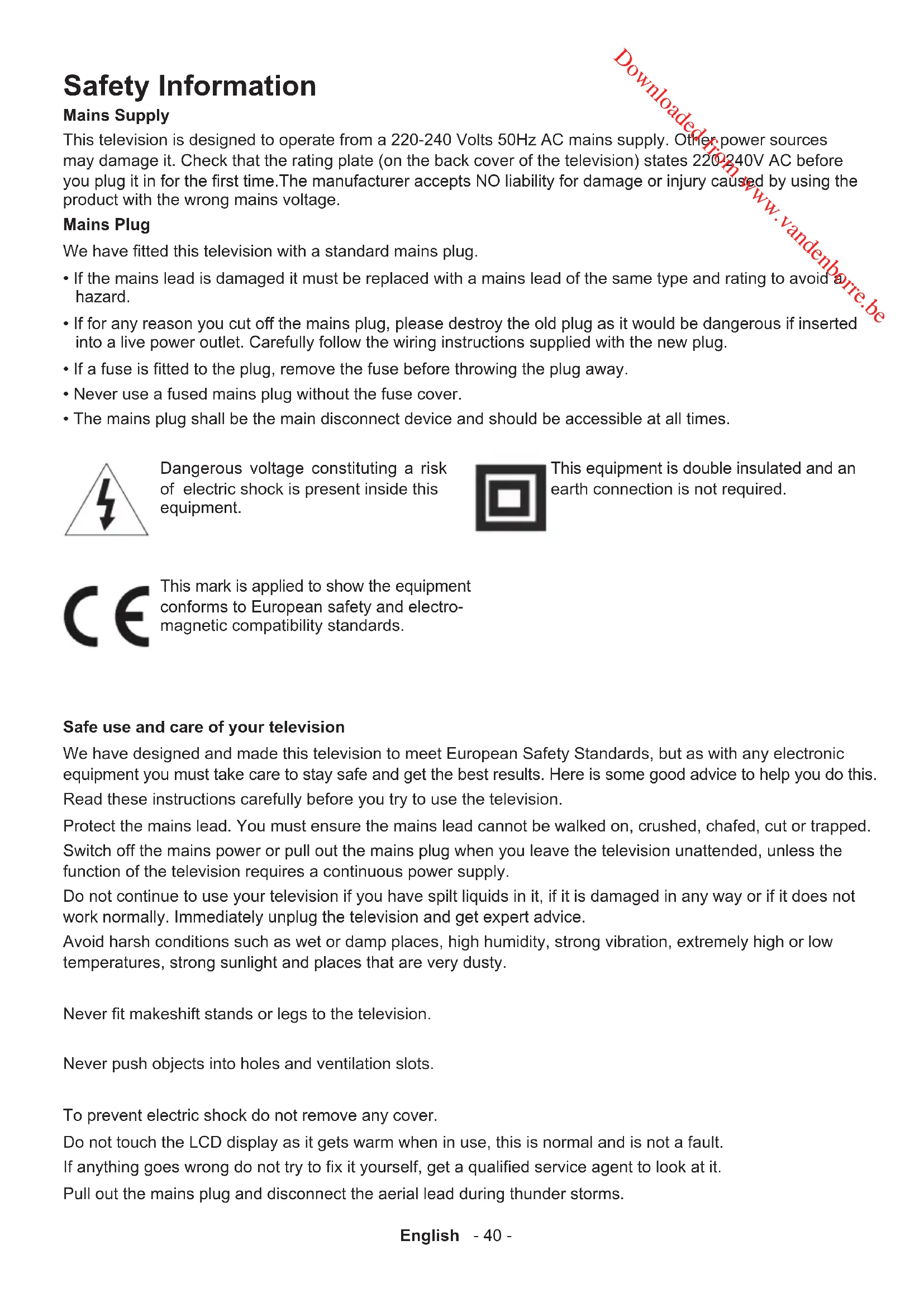 - AV and HDMI Signal Compatibility Information for Users on Disposal of Old Equipment and Batteries [European Union only] These symbols indicate that equipment with these symbols should not be disposed of as general household waste. If you want to dispose of the product or battery, please consider the collection systems or facilities for appropriate recycling. Notice: The sign Pb below the symbol for batteries indicatesthat this battery contains lead.ProductsBattery Downloaded from www.vandenborre.beEnglish - 40 - Safety Information Mains Supply This television is designed to operate from a 220-240 Volts 50Hz AC mains supply. Other power sources may damage it. Check that the rating plate (on the back cover of the television) states 220-240V AC before you plug it in for the rst time.The manufacturer accepts NO liability for damage or injury caused by using the product with the wrong mains voltage. Mains Plug We have tted this television with a standard mains plug. p. 57