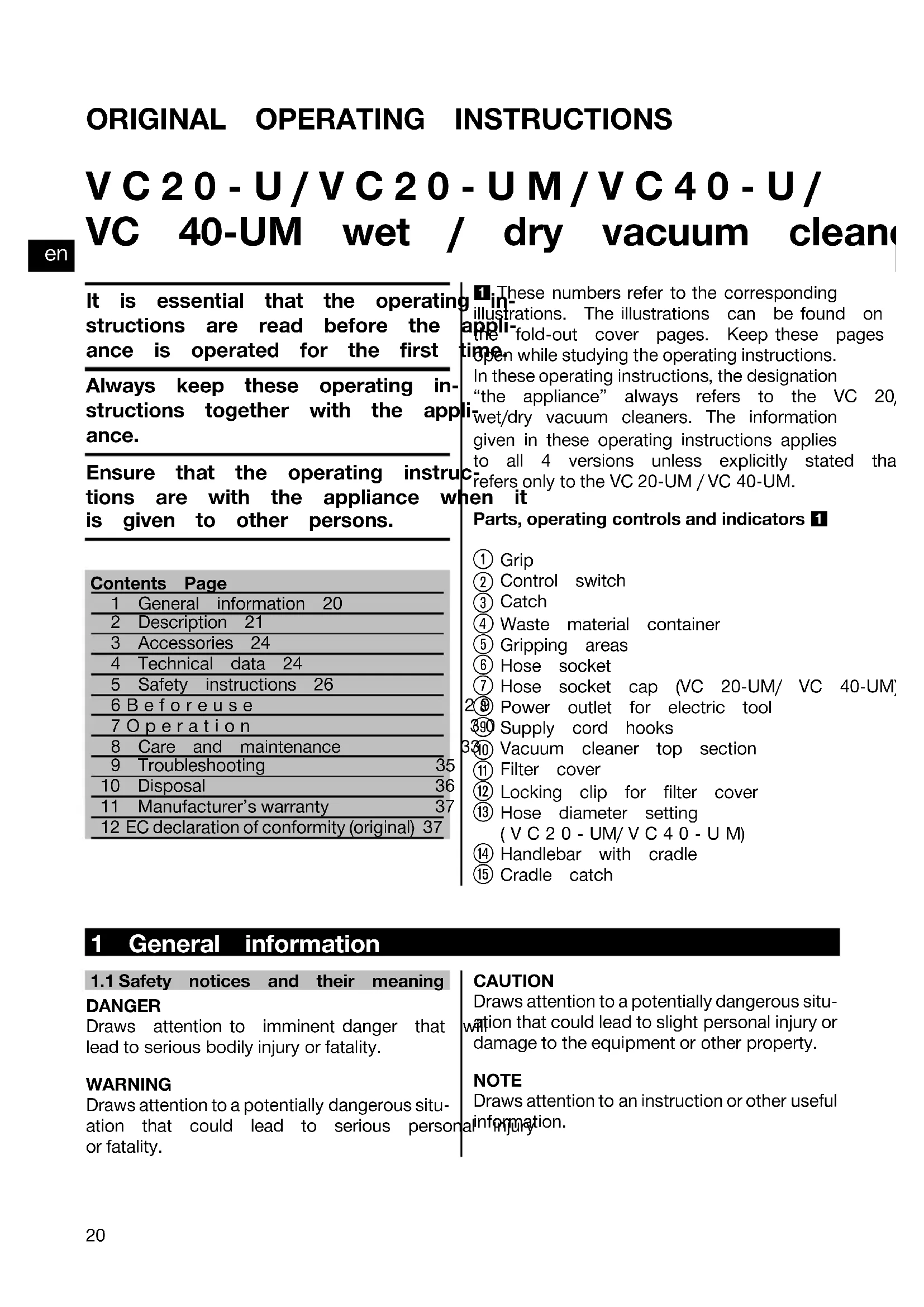 Printed: 08.07.2013 | Doc-Nr: PUB / 5071294 / 000 / 02ORIGINAL OPERATING INSTRUCTIONS VC20‑U/VC20‑UM/VC40‑U/ VC 40‑UM wet / dry vacuum cleaner It is essential that the operating in-structions are read before the appli-ance is operated for the first time.Always keep these operating in-structions together with the appli-ance.Ensure that the operating instruc-tions are with the appliance when itis given to other persons.Contents Page1 General information 202 Description 213 Accessories 244 Technical data 245 Safety instructions 266Beforeuse 297Operation 308 Care and maintenance 339 Troubleshooting 3510 Disposal 3611 Manufacturer’s warranty 37 12 EC declaration of conformity (original) 37 1 These numbers refer to the corresponding illustrations. The illustrations can be found onthe fold-out cover pages. Keep these pages open while studying the operating instructions. In these operating instructions, the designation “the appliance” always refers to the VC 20/40 wet/dry vacuum cleaners. The information given in these operating instructions applies to all 4 versions unless explicitly stated that it refers only to the VC 20‑UM / VC 40‑UM. Parts, operating controls and indicators 1