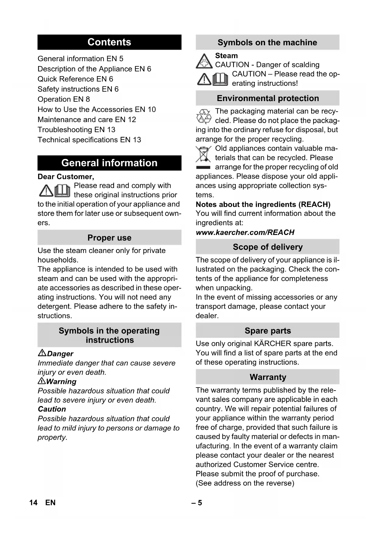 • •• Baumwolle, Leinen Pflege und Wartung Ausspülen des Kessels Entkalken des Kessels Härtbereich ° dH mmol/l KF I weich 0- 7 0-1,3 55 II mittel 7-14 1,3-2,5 45 III hart 14-21 2,5-3,8 35 IV sehr hart >21 >3,8 25 12 DE– 13 mal mit kaltem Wasser ausspülen, um alle Rückstände des Entkalkers zu ent- fernen. Vorhandenes Wasser vollständig aus dem Kessel leeren (siehe Abbildung ). Hinweis: Bodentuch und Frotteeüberzug sind bereits vorgewaschen und können so- fort zum Arbeiten mit dem Dampfreiniger verwendet werden. Waschen Sie verschmutzte Bodentücher und Frotteeüberzüge bei 60°C in der Waschmaschine. Verwenden Sie keinen Weichspüler, damit die Tücher den Schmutz gut aufnehmen können. Die Tü- cher sind für den Trockner geeignet. Störungen haben oft einfache Ursachen, die Sie mit Hilfe der folgenden Übersicht selbst beheben können. Im Zweifelsfall oder bei hier nicht genannten Störungen wenden Sie sich bitte an den autorisierten Kundendienst. Gefahr Wartungsarbeiten nur bei gezogenem Netzstecker und abgekühltem Dampfreini- ger durchführen. Reparaturarbeiten am Gerät dürfen nur vom autorisierten Kundendienst durchge- führt werden. Dampfkessel entkalken. Gerät ausschalten. Siehe „Wasser nachfüllen“ Seite 9. Dampfhebel ist mit der Verriegelung / Kin- dersicherung gesichert. Wahlschalter für Dampfmenge nach vorne stellen. Temperaturregler auf Stufe ••• stellen. Kessel des Dampfreinigers ausspülen oder entkalken. Bei längeren Bügelpausen kann Dampf in der Dampfleitung kondensieren. Den ersten Dampfstoß auf ein separa- tes Tuch richten. Dampfpistole so lange drücken bis we- niger Wasser kommt. Dampfkessel entkalken. Technische Änderungen vorbehalten! Pflege des Zubehörs Hilfe bei Störungen Lange Aufheizzeit Dampfkessel ist verkalkt. Kein Dampf Kein Wasser im Dampfkessel. Dampfhebel lässt sich nicht drücken. Dampfdruck-Bügeleisen „spuckt“ Wasser! Nach Bügelpausen kommen Wassertropfen aus dem Dampfdruck- Bügeleisen. Hoher Wasseraustrag Dampfkessel zu voll. Dampfkessel ist verkalkt. Technische Daten Stromanschluss Spannung 220-240 V 1~50/60 Hz Schutzklasse I Schutzgrad IPX4 Leistungsdaten Heizleistung 1800 W Heizleistung Bügeleisen 700 W Betriebsdruck max. 0,35 MPa Aufheizzeit 6 Minuten Dampfmenge - Dauerdampfen 50 g/min - Dampfstoß max. 110 g/min Maße Dampfkessel 1,0 l Gewicht (ohne Zubehör) 3,1 kg Breite 250 mm Länge 382 mm Höhe 256 mm 13DEEnglish – 5 Dear Customer, Please read and comply with these original instructions prior to the initial operation of your appliance and store them for later use or subsequent own- ers. Use the steam cleaner only for private households. The appliance is intended to be used with steam and can be used with the appropri- ate accessories as described in these oper- ating instructions. You will not need any detergent. Please adhere to the safety in- structions. Danger Immediate danger that can cause severe injury or even death. 몇 Warning Possible hazardous situation that could lead to severe injury or even death. Caution Possible hazardous situation that could lead to mild injury to persons or damage to property. Steam CAUTION - Danger of scalding CAUTION – Please read the op- erating instructions! The packaging material can be recy- cled. Please do not place the packag- ing into the ordinary refuse for disposal, but arrange for the proper recycling. Old appliances contain valuable ma- terials that can be recycled. Please arrange for the proper recycling of old appliances. Please dispose your old appli- ances using appropriate collection sys- tems. Notes about the ingredients (REACH) You will find current information about the ingredients at: www.kaercher.com/REACH The scope of delivery of your appliance is il- lustrated on the packaging. Check the con- tents of the appliance for completeness when unpacking. In the event of missing accessories or any transport damage, please contact your dealer. Use only original KÄRCHER spare parts. You will find a list of spare parts at the end of these operating instructions. The warranty terms published by the rele- vant sales company are applicable in each country. We will repair potential failures of your appliance within the warranty period free of charge, provided that such failure is caused by faulty material or defects in man- ufacturing. In the event of a warranty claim please contact your dealer or the nearest authorized Customer Service centre. Please submit the proof of purchase. (See address on the reverse) Contents General information EN 5 Description of the Appliance EN 6 Quick Reference EN 6 Safety instructions EN 6 Operation EN 8 How to Use the Accessories EN 10 Maintenance and care EN 12 Troubleshooting EN 13 Technical specifications EN 13 General information Proper use Symbols in the operating instructions Symbols on the machine Environmental protection Scope of delivery Spare parts Warranty 14 EN– 6 These operating instructions describe the maximum equipment. Depending on the model, there are differences in the scopes of delivery (see packaging). Illustrations on fold-out page! Illustrations on Page 2 1 Unscrew the safety lock and fill the steam cleaner with a max. of 1 litre of water. 2 Screw in safety cap. 3 Insert the steam plug into the appliance connector. 4 Plug in the main plug.Turn on the appli- ance.The green and orange indicator lamps light up. 5 Wait until the orange indicator lamp goes out. 6 Connect the accessories to the steam gun. The steam cleaner is ready to use. Danger The appliance may not be used in areas where a risk of explosion is present. If the appliance is used in hazardous ar- eas the corresponding safety provisions must be observed. Never use the appliance in pools con- taining water. The device should not be used to clean electrical appliances such as oven, ex- haust, micro-wave, televisions, lamps, hair-dryer, electrical heating systems, etc. Check the faultless condition of the ap- pliance and the accessorie