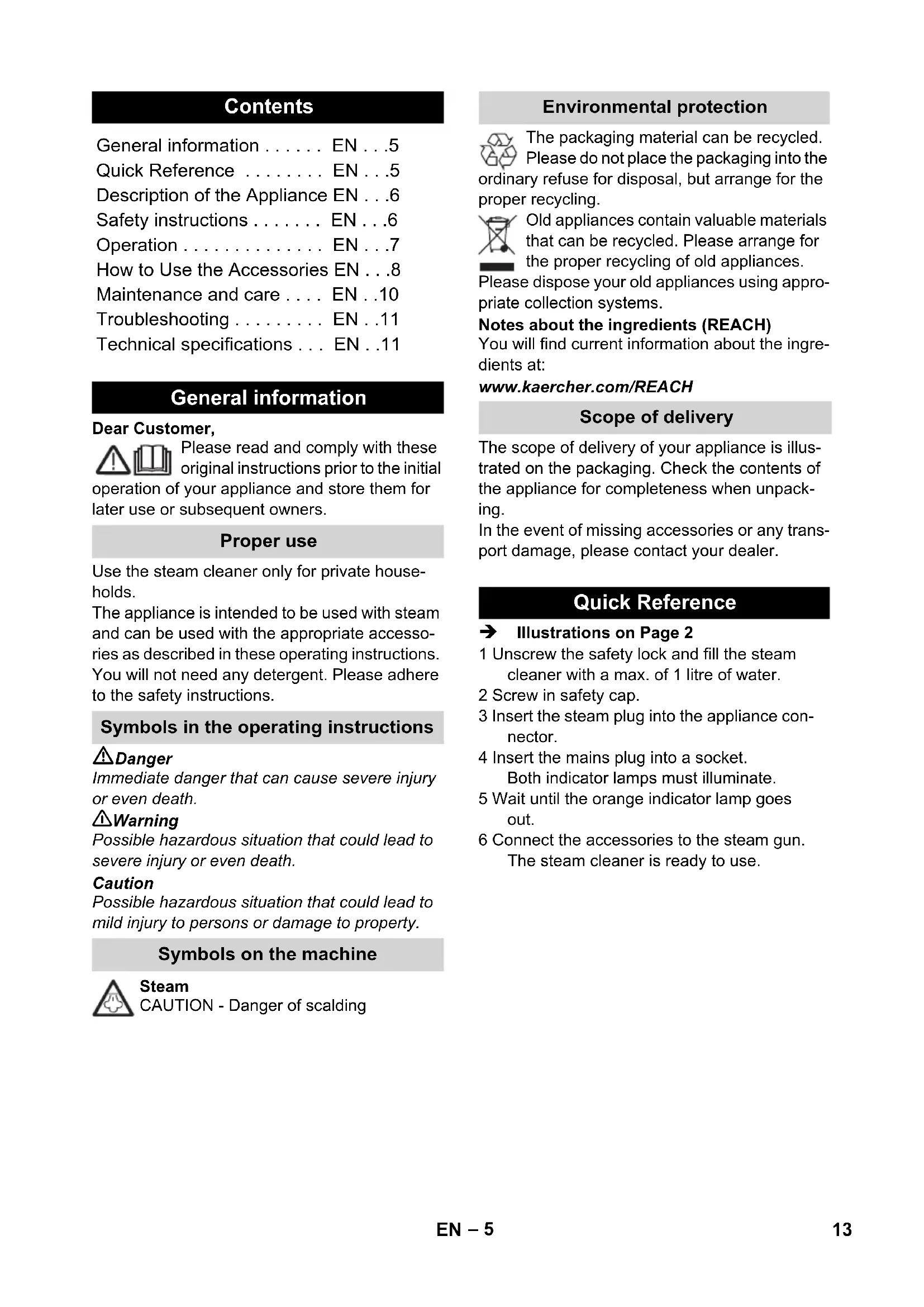 - Schutzgrad IP X4 Schutzklasse I Leistungsdaten Heizleistung 1500 W Heizleistung Bügeleisen 750 W Betriebsdruck max. 0,32 MPa Aufheizzeit 8 Minuten Dampfmenge max. 40 g/min Maße Dampfkessel 1,0 l Länge 380 mm Breite 254 mm Höhe 260 mm Gewicht (ohne Zubehör) 2,9 kg 12 DE– 5 Dear Customer, Please read and comply with these original instructions prior to the initial operation of your appliance and store them for later use or subsequent owners. Use the steam cleaner only for private house- holds. The appliance is intended to be used with steam and can be used with the appropriate accesso- ries as described in these operating instructions. You will not need any detergent. Please adhere to the safety instructions. Danger Immediate danger that can cause severe injury or even death. 몇 Warning Possible hazardous situation that could lead to severe injury or even death. Caution Possible hazardous situation that could lead to mild injury to persons or damage to property. Steam CAUTION - Danger of scalding The packaging material can be recycled. Please do not place the packaging into the ordinary refuse for disposal, but arrange for the proper recycling. Old appliances contain valuable materials that can be recycled. Please arrange for the proper recycling of old appliances. Please dispose your old appliances using appro- priate collection systems. Notes about the ingredients (REACH) You will find current information about the ingre- dients at: www.kaercher.com/REACH The scope of delivery of your appliance is illus- trated on the packaging. Check the contents of the appliance for completeness when unpack- ing. In the event of missing accessories or any trans- port damage, please contact your dealer. Illustrations on Page 2 1 Unscrew the safety lock and fill the steam cleaner with a max. of 1 litre of water. 2 Screw in safety cap. 3 Insert the steam plug into the appliance con- nector. 4 Insert the mains plug into a socket. Both indicator lamps must illuminate. 5 Wait until the orange indicator lamp goes out. 6 Connect the accessories to the steam gun. The steam cleaner is ready to use. Contents General information