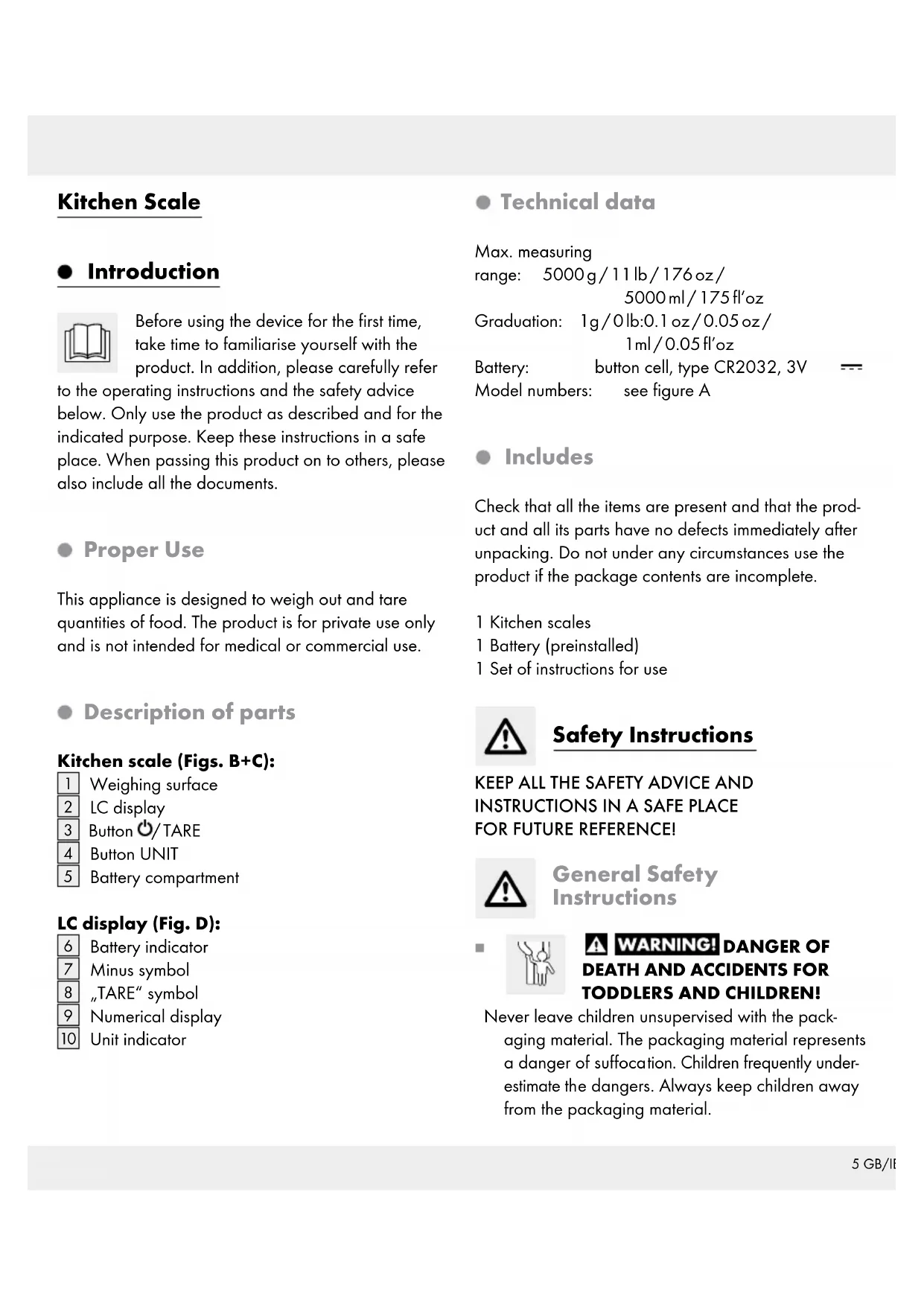 Unit indicator Technical data Max. measuring range: 5000 g / 11 lb / 176 oz / 5000 ml / 175 fl’oz Graduation: 1g / 0 lb:0.1 oz / 0.05 oz / 1ml / 0.05 fl’oz Battery: button cell, type CR2032, 3V Model numbers: see figure A Includes Check that all the items are present and that the prod- uct and all its parts have no defects immediately after unpacking. Do not under any circumstances use the product if the package contents are incomplete. 1 Kitchen scales 1 Battery (preinstalled) 1 Set of instructions for use Safety Instructions