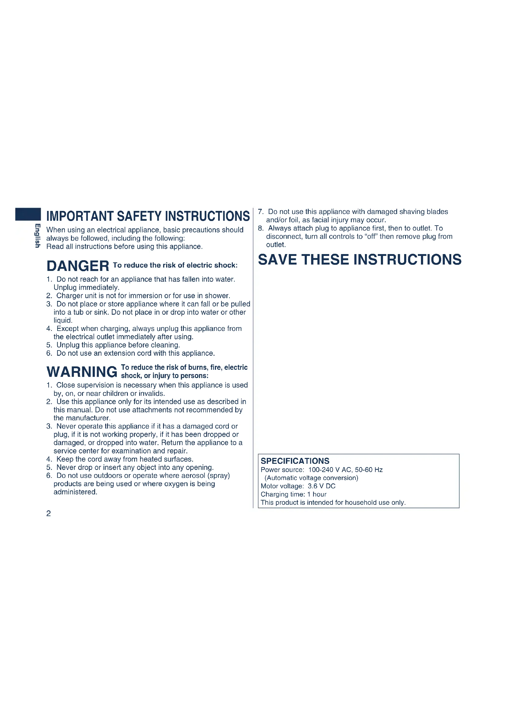 disconnect, turn all controls to “off” then remove plug from outlet. SPECIFICATIONS Power source: 100-240 V AC, 50-60 Hz (Automatic voltage conversion) Motor voltage: 3.6 V DC Charging time: 1 hour This product is intended for household use only. ES8228_USA.indb 2 2006/08/21 15:51:353 English Important Before use This Wet/Dry shaver can be used for wet shaving with shaving lather or for dry shaving. You can use this watertight shaver in the shower and clean it in water. The following is the symbol of Wet shaver. The symbol means that hand-held part may be used in a bath or shower. Treat yourself to wet lather shaves for at least three weeks and notice the difference. Your Panasonic Wet/Dry shaver requires a little time to get used to because your skin and beard need about a month to adjust to any new shaving method. Using the shaver Caution - The outer foil is very thin and can be damaged if not used correctly. Check that the foil is not damaged before using the shaver. Do not use the shaver if the foil etc. is damaged as you will cut your skin. Charging the shaver Only use the supplied power cord and recharger to charge the shaver. Plug in the adaptor into a household outlet where there is no moisture and handle it with dry hands. The shaver and the recharger may become warm during use and charging. However, this is not a malfunction. Do not charge the shaver where it will be exposed to direct sunlight or other heat sources. Hold the adaptor when disconnecting it from the household outlet. If you tug on the power cord, you may damage it. Contact an authorized service center if the power cord gets damaged. The adaptor is intended to be correctly oriented in a vertical or floor mount position. Cleaning the shaver Disconnect the power cord from the shaver before cleaning it to prevent electric shock. Keep both the inner blades inserted. If only one of the inner blades is inserted, the shaver may be damaged. If you clean the shaver with water, do not use salt water or hot water. Do not soak the shaver in water for a long period of time. Wipe it with a cloth dampened with soapy water. Do not use thinner, benzine or alcohol. Storing the shaver Disconnect the power cord when storing the shaver. Do not bend the power cord or wrap it around the shaver. Do not leave this shaver within the reach of small children. Keep these operating instructions in a safe place. Self-cleaning recharger Do not clean the adaptor or the self-cleaning recharger in water as it will damage them or cause an electric shock. Do not remove the shaver from the self-cleaning recharger while using a course that includes the “Dry” function. A heater is used so the area around the blades becomes extremely hot and you may burn yourself. Place the self-cleaning recharger on a level and stable surface. Otherwise the cleaning liquid may spill and discolor leather products or other surfaces. Wipe it immediately. The self- cleaning recharger cleans the inner blades and the system outer foil. Wash with water to remove beard trimmings in other areas. ES8228_USA.indb 3 2006/08/21 15:51:354 English Parts identification